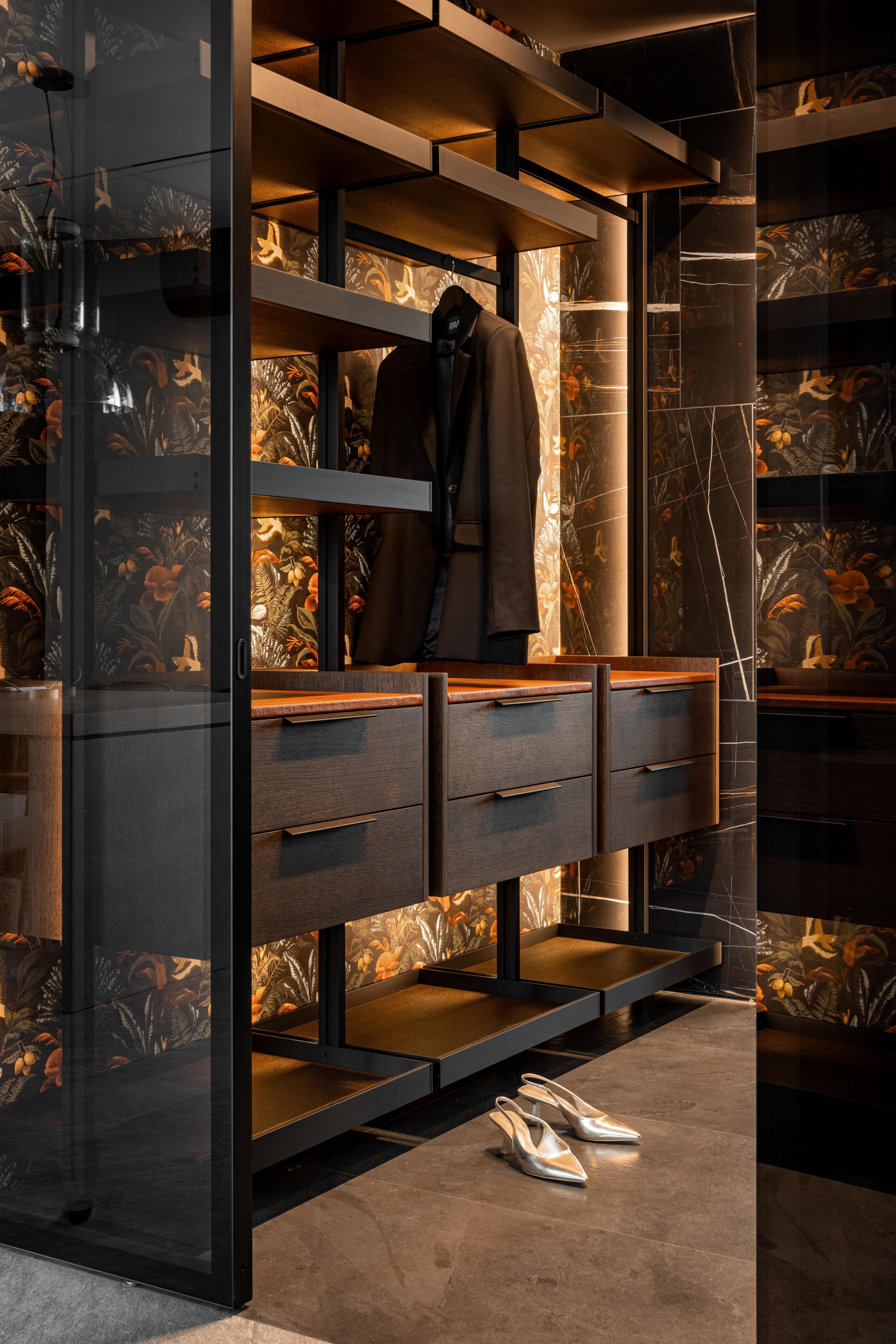 Рядом — не менее уютная гардеробная с теплой подсветкой и красивыми обоями с цветочным принтом. Она небольшая, но очень вместительная.