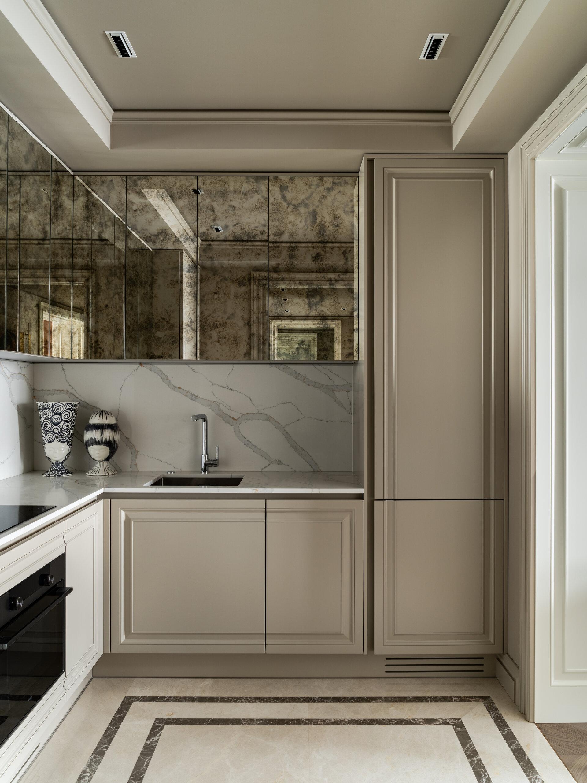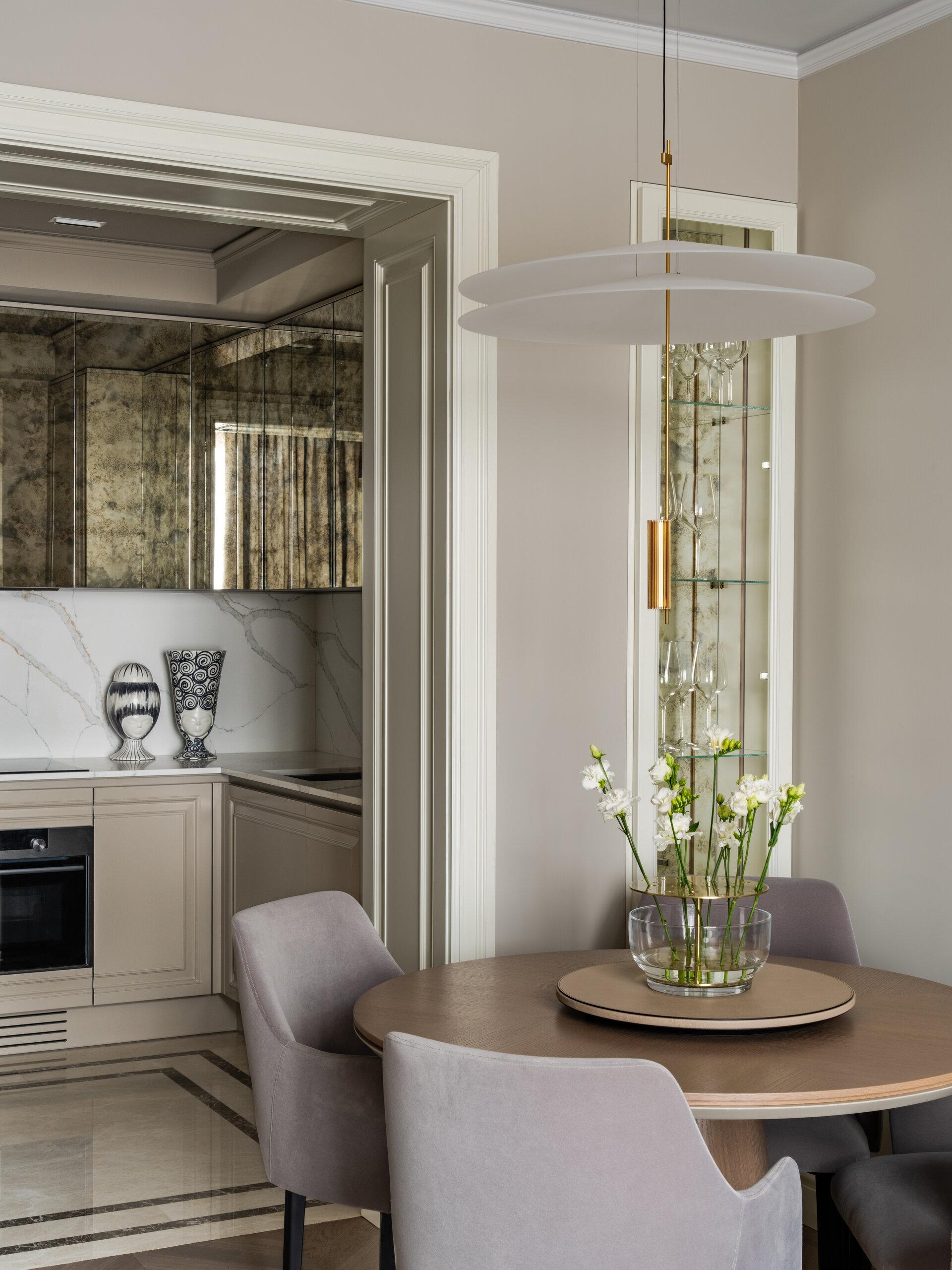 Похожий прием с буазери мы видим и на кухне — ее фасады не выбиваются из общей геометрии. Кроме того, они украшены состаренным зеркалом, красиво отражающим свет. В общую композицию ненавязчиво вписывается обеденный стол, а над ним — акцентный подвесной светильник.