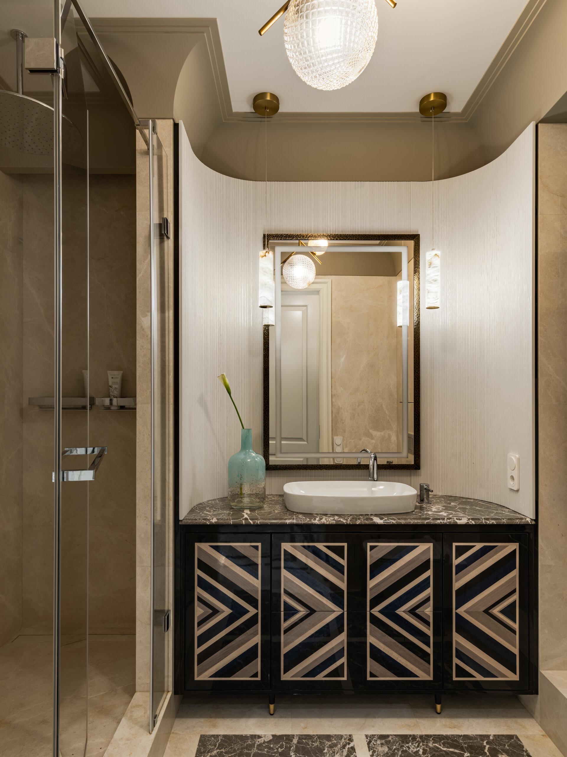 Подвесные светильники, Loft concept. Раковина, Catalano. Сантехника, Zucchetti. Тумба изготовлена на заказ из шпона эвкалипта в технике маркетри. Зеркало изготовлено на заказ по эскизу заказчиков, Ambiu.