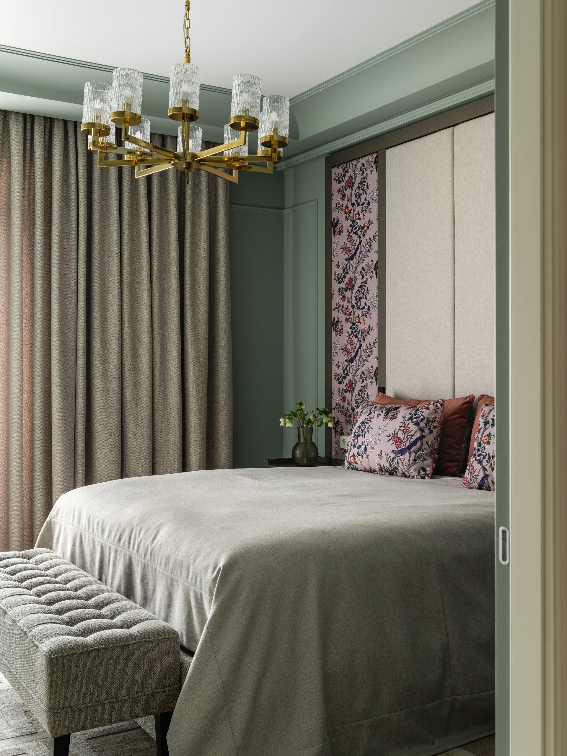 Кровать и скамья, ISK Contract. Ткань на панелях изголовья, Silver Studio. Ткань покрывала и обивка скамьи, Seba. Люстра, Loft concept. Вазы, Guaxs.