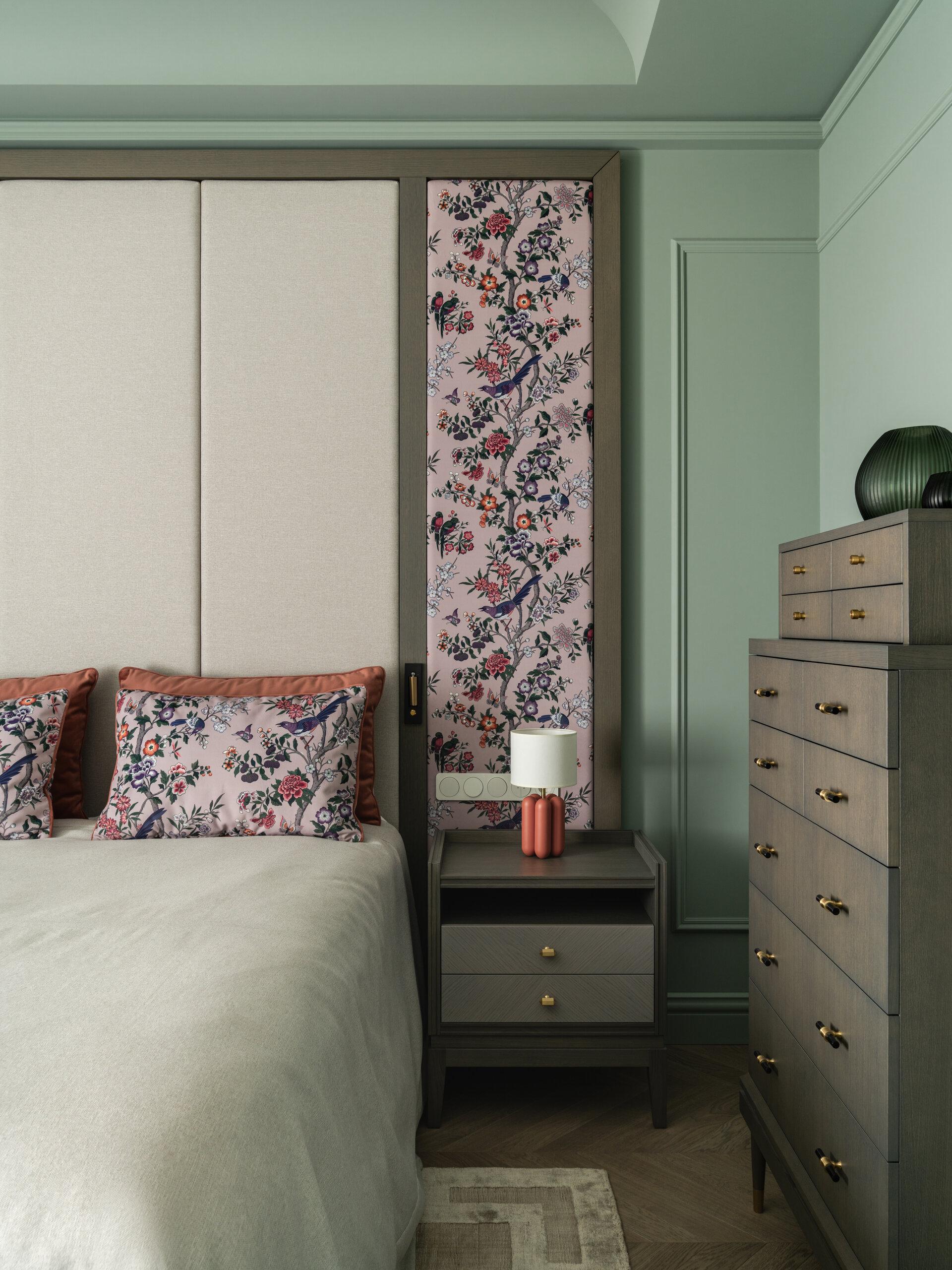 Спальню украшает изголовье с текстильным панно и деревянной рамой. Геометрию комнаты формирует буазери, переходящее с одной стены на другую.