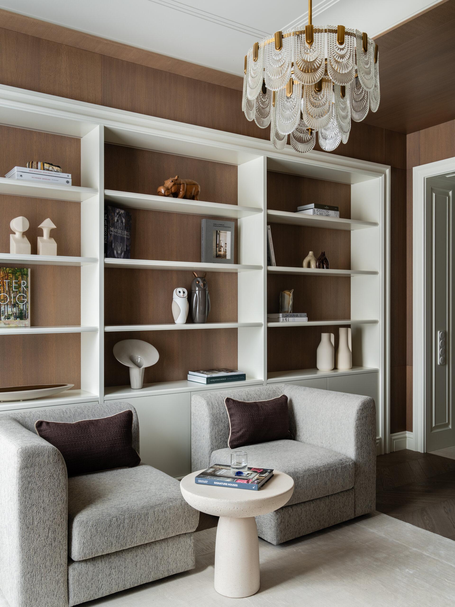 Библиотека и стеновые панели ISK Contract. Люстра, Loft concept. Кресла, ISK Contract. Статуэтки и ваза, Bosa. Статуэтки, Gardeco. Вазы, Bolia. Подушки, Josephine Testa.