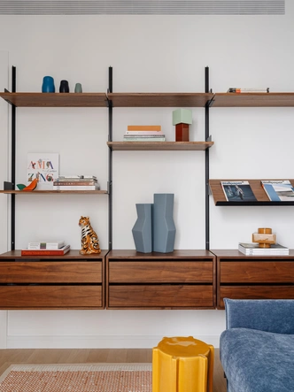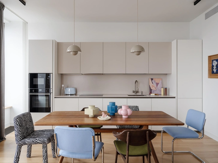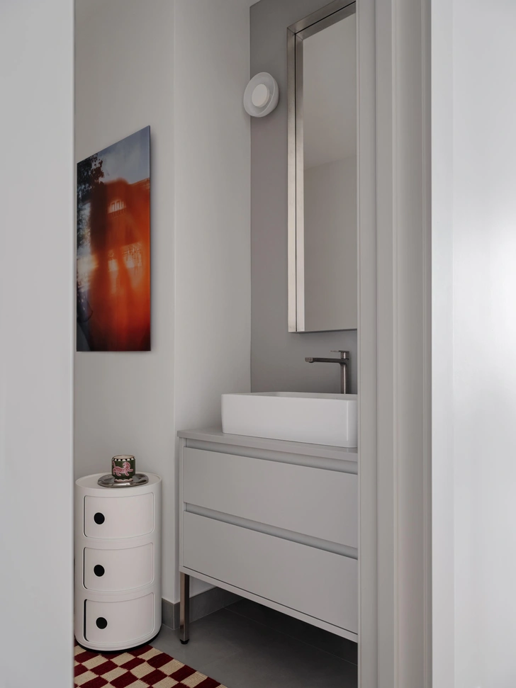Несмотря множество галерейных предметов, ярких и необычных принтов, квартира получилась в целом спокойной. Вот что значит правильно выстроить архитектурную базу и точно спланировать хранение, где-то подчеркнуть, а где-то «растворить» объемы (как, например, шкаф в коридоре), оставив место для искусства. В проекте ужились две абсолютно разные философии: less is more («меньше значит больше») у нас никак не перечит less is bore («меньше значит скучнее», как Роберт Вентури когда-то пошутил над принципом Людвига Миса ван дер Роэ).