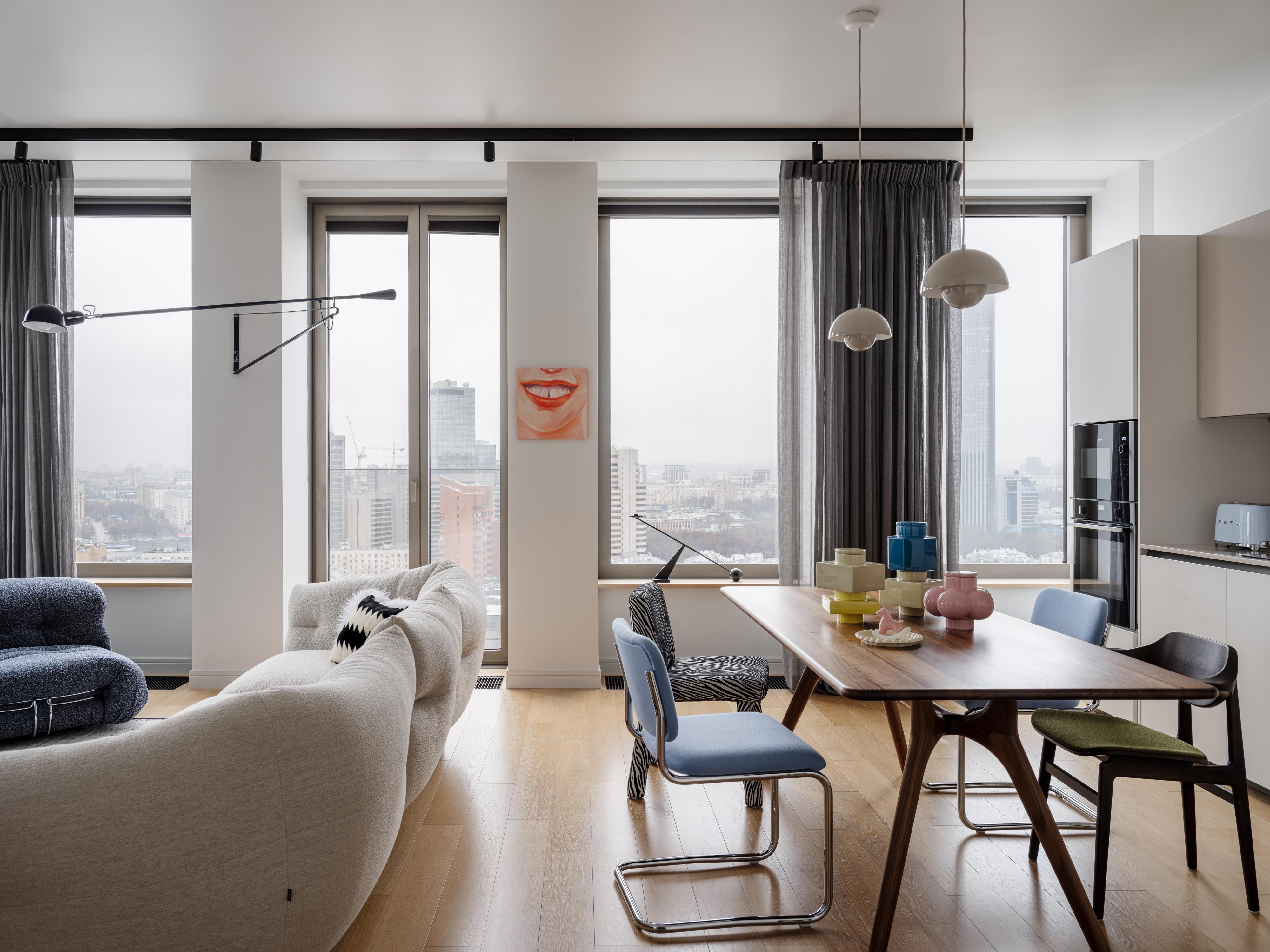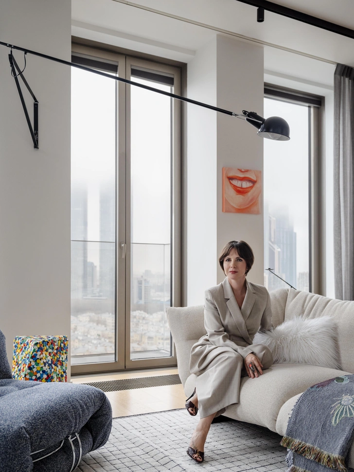 В каждом помещении свои герои, своя история. Мы хотели создать пространство, в котором хочется разглядывать все. Тут нет лишних предметов, каждый что-то значит. А еще квартиру украшают панорамные окна с потрясающим видом на Москву-реку и Сити. Я рада, что мы не стали закрывать их, зато предусмотрели блэкауты и легкие полупрозрачные шторы из тонкой шерсти.