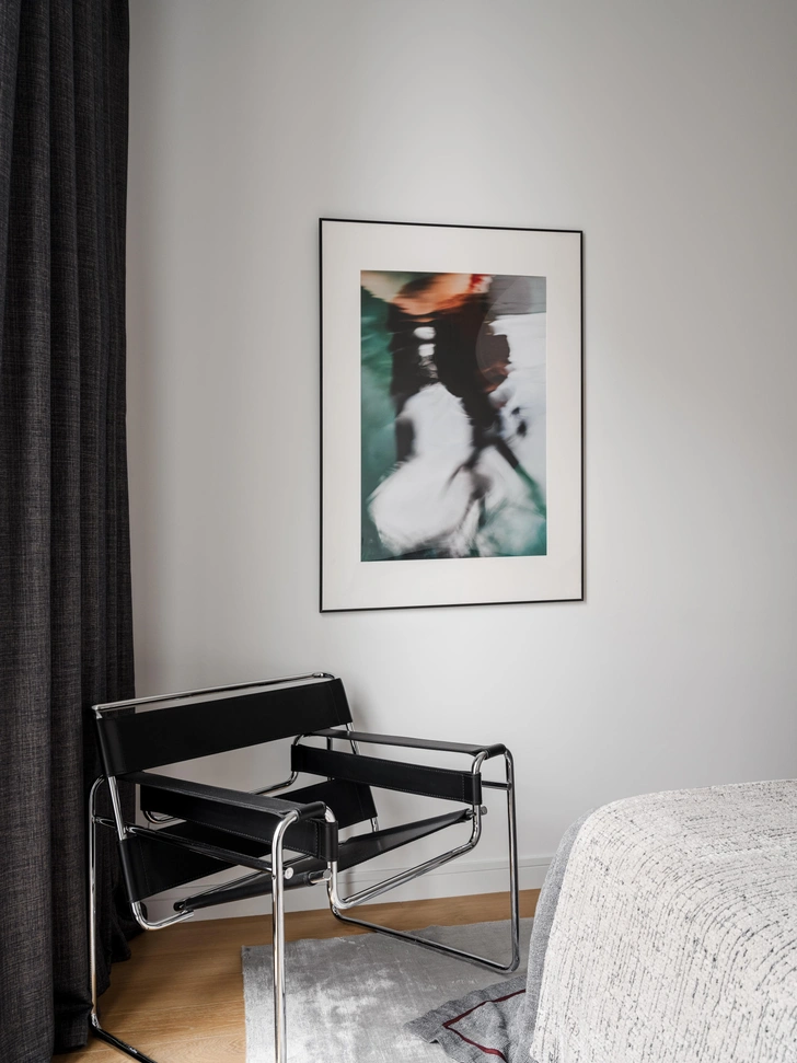 В спальне рядом с удобнейшей кроватью Poliform в обивке из серого хлопка свое почетное место занимает кресло Wassily, переизданного компанией Knoll. Его брутальная архитектурность смягчается нежностью рисовой бумаги светильника Akari, Vitra дизайна Исаму Ногучи, а покрывало и саше из кашемира и легкой шерсти лишь усиливают этот контраст, создавая обволакивающую атмосферу. А напротив кровати — работа Кати Алагич «Воспоминания воды», она удачно вписалась в атмосферу спальни. Заказчица родом из Иркутска, поэтому она хотела что-то-то, что напомнит ей водную стихию Байкала.