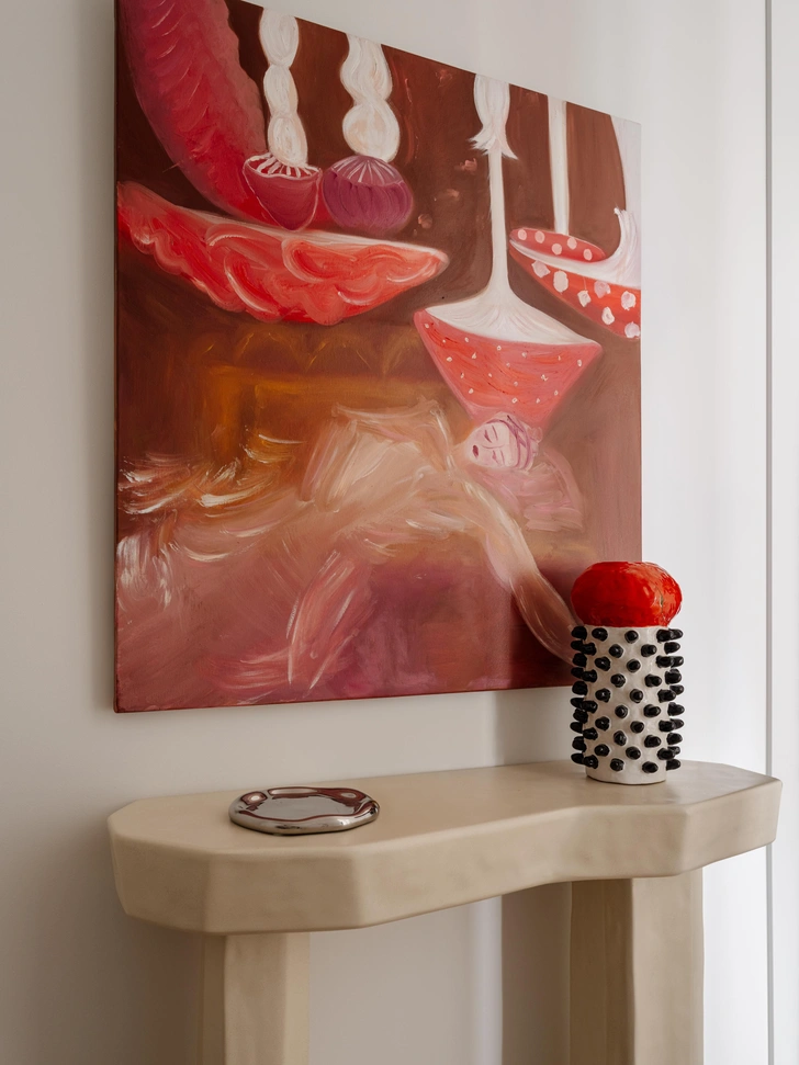 Картина на винтажной тумбе «Сюрприз XI», галерея «Виктория». Винтажный комод, Beke Gallery. Лампа на комоде, Nessino Artimide, GK Concept.