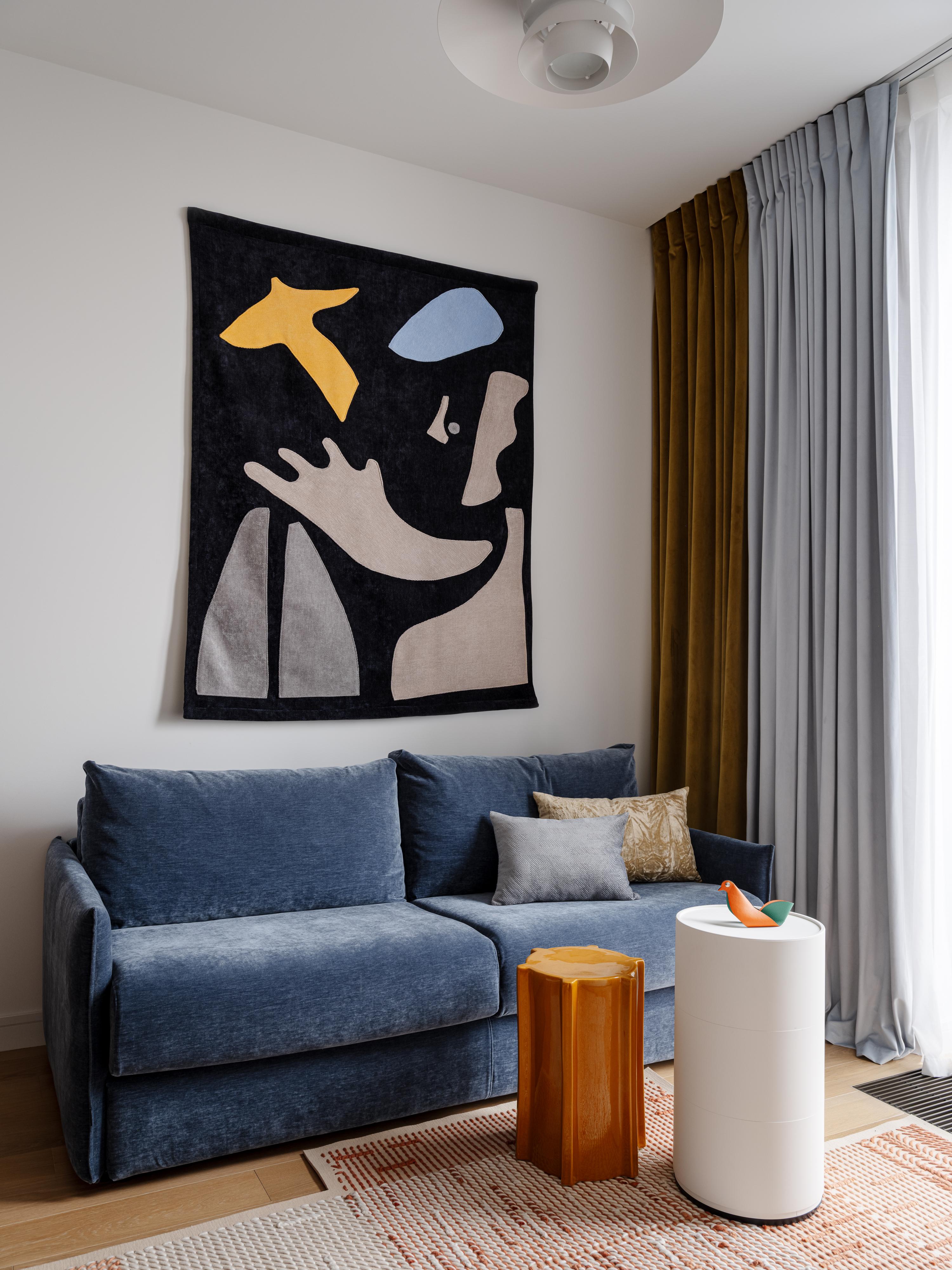 Диван, Ditre Italia. Панно Out of the cage, Дмитрий Гусар, Craftnotes. Столик, Kartell, GK Concept. Столик, Serax, GK Concept. Ковер Canevas GEO, Gan, салон «Предметы». Шторы, ателье Artique.