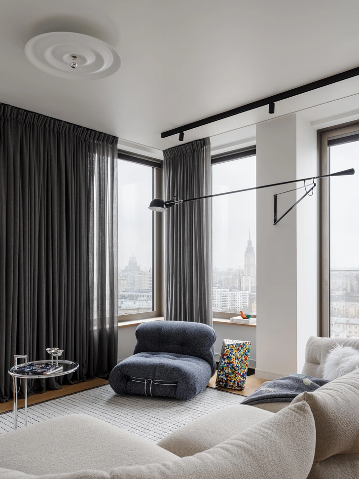 Диван Moncloud, дизайн Патрисии Уркиолы, Сassina. Кресло Soriana, дизайн Афры и Тобиа Скарпа, Сassina. Потолочный свет, W Alma, Wastberg. Столик E1027, дизайн Эйлин Грей, Сlassicon. Настенное бра, Flos. Столик у кресла, Normann Copenhagen, cалон «Предметы». Ковер, Le Kover. Шторы, ателье Artique.