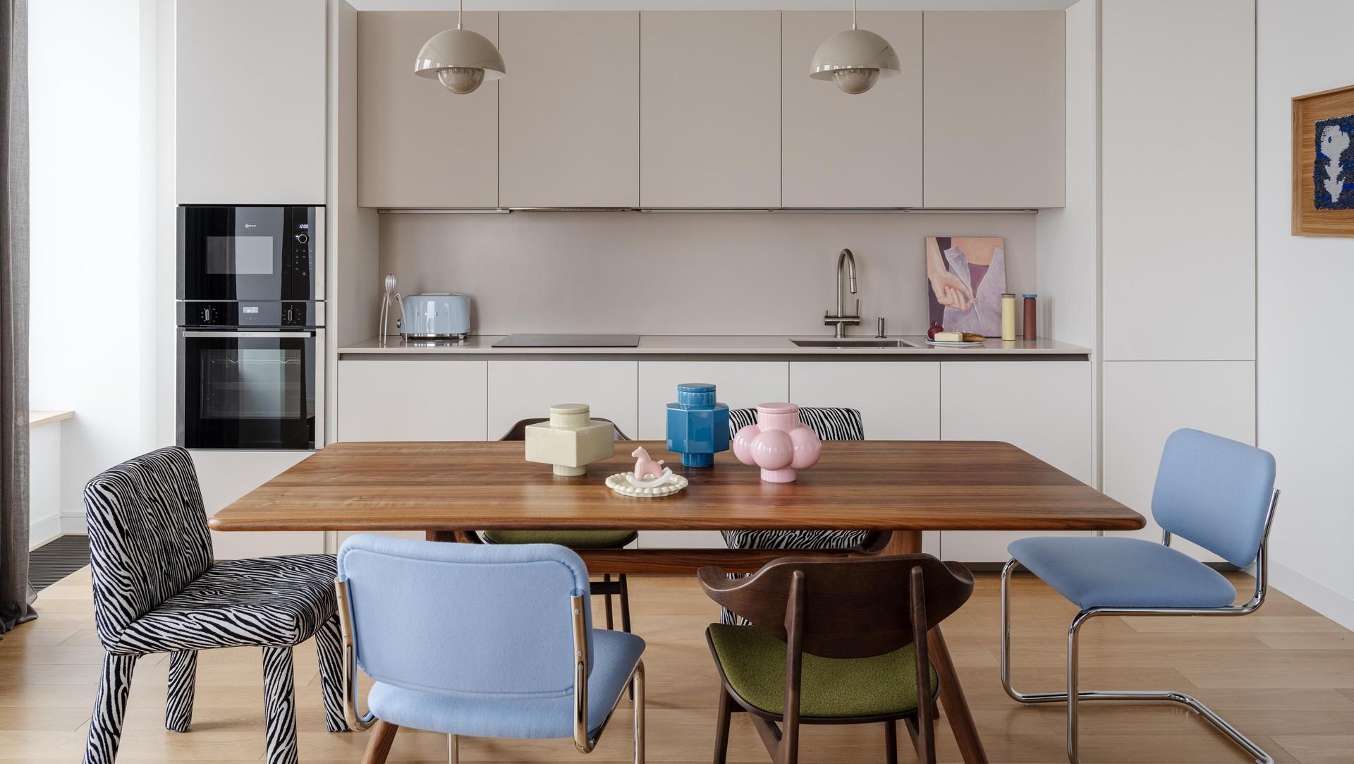 Обеденный стол, More-Moebel, GK Concept. Стулья в голубой обивке, Knoll, GK Concept. Стулья в зеленой обивке, Norr 11, GK Concept. Стул с зебра-принтом, Annika Studio. Керамика на столе, Normann Copenhagen, салон «Предметы». Солонка и перечница HAY, GK Сoncept. Работа на столешнице Lila, Евгения Бардина. Гобелен «Цветущая голова», Полина Долгая, Craftnotes.