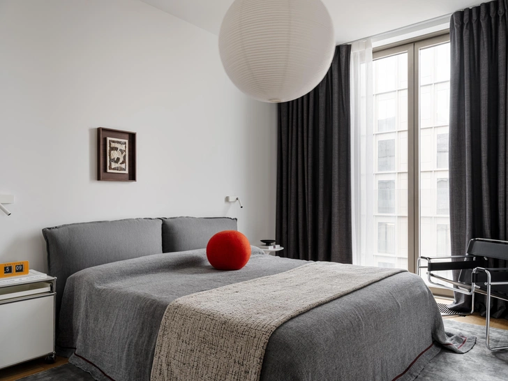 Кровать, Meridiani. Покрывало, саше, Atelier Tati. Подушка-шар, шторы, ателье Artique. Работа на стене «Мыслеформы», Полина Долгая, Сraftnotes. Потолочный свет Akari, Vitra, GK Concept.