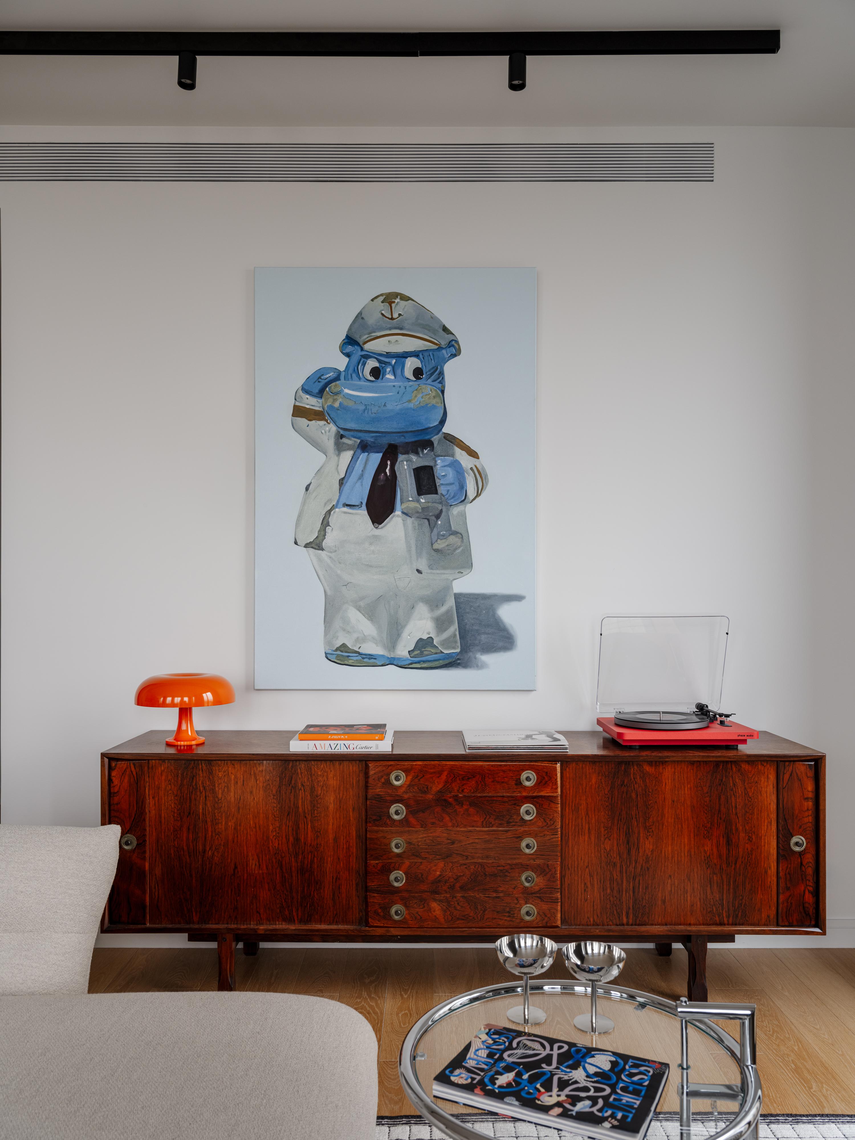 Отдельная история — поиск подходящего искусства. Мы вместе ходили с заказчицей на выставки, долго, не спеша думали и прислушивались к своим ощущениям. Одна из первых и самых ярких работ, которая заняла почетное месте на винтажном комоде в зоне гостиной — огромный голубой бегемот из «Киндер Сюрприза». Это картина екатеринбургской художницы, увидела ее на Cosmoscow. Этот образ навевает приятные воспоминания из детства и, конечно, не оставляет равнодушными гостей.