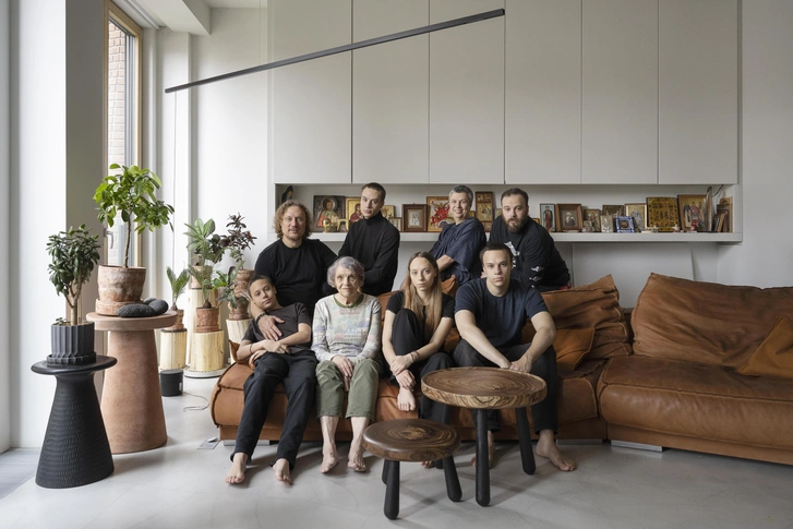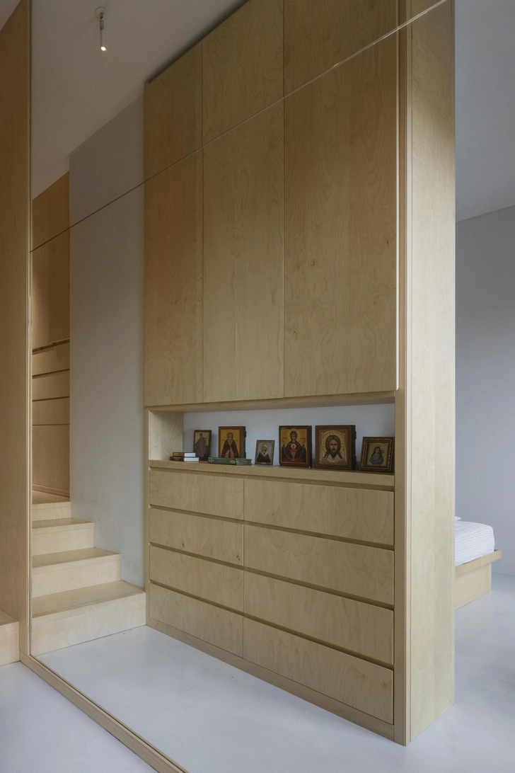 Главная смысловая составляющая общей зоны — полка, на которой расположился небольшой, но очень ценный для нашей семьи иконостас с образами православных святых. Вторая полка с иконами находится в мастер-спальне.