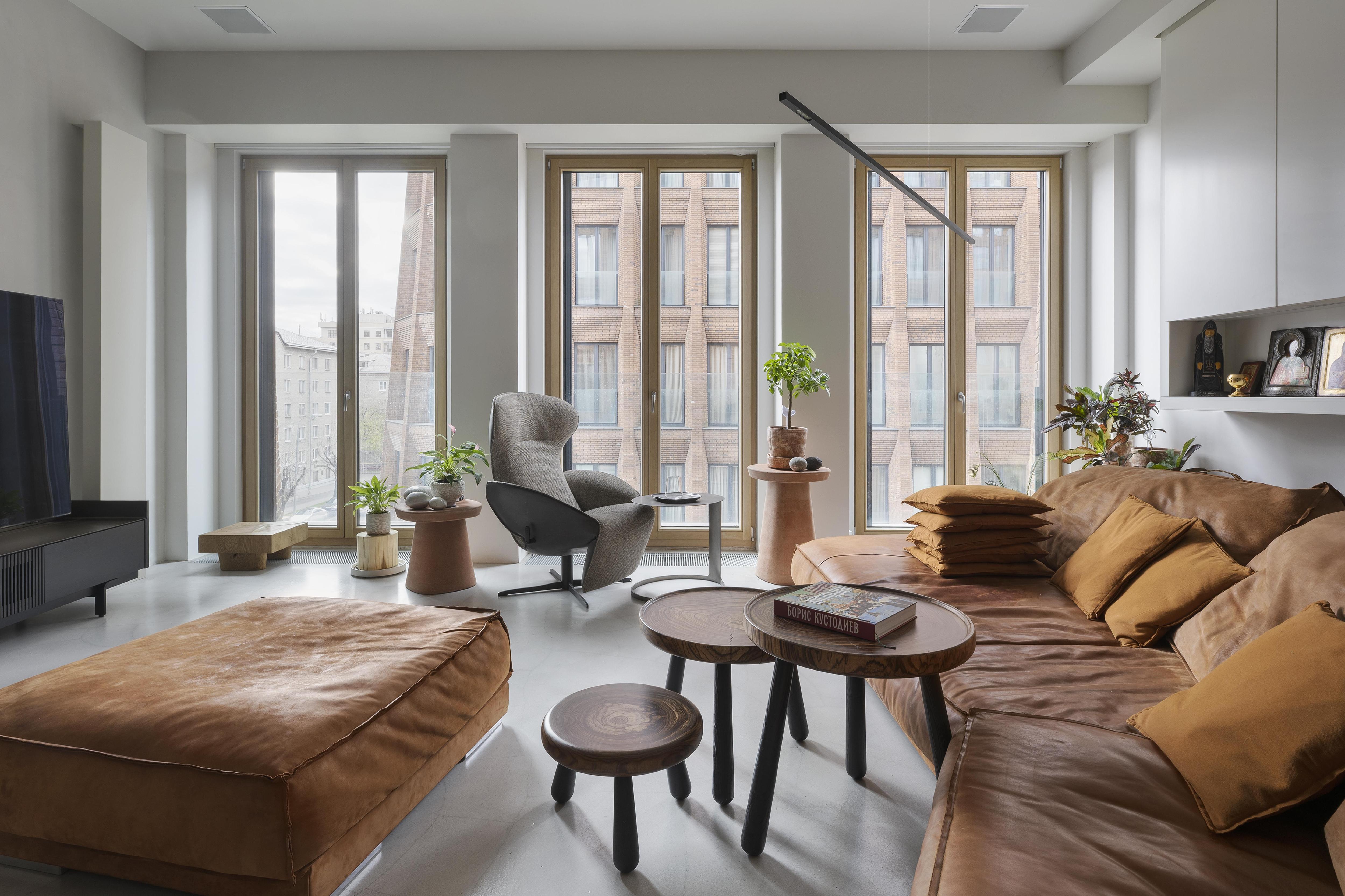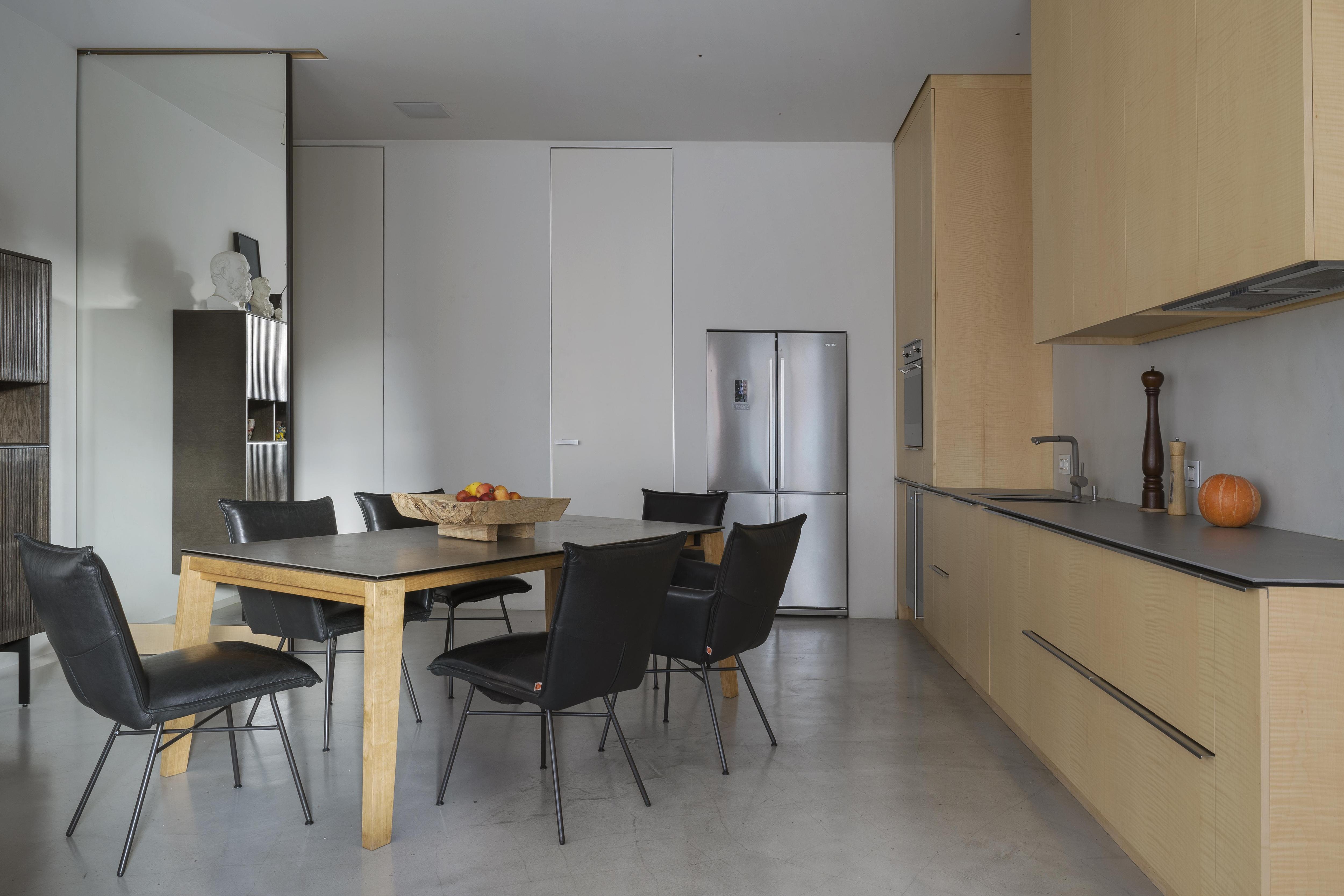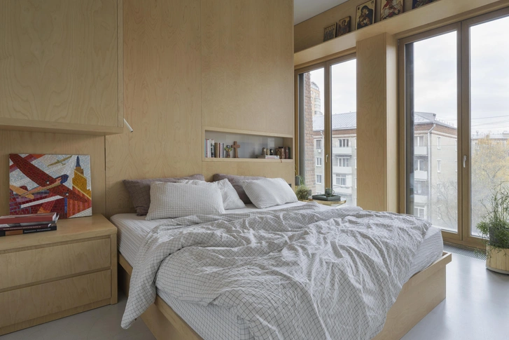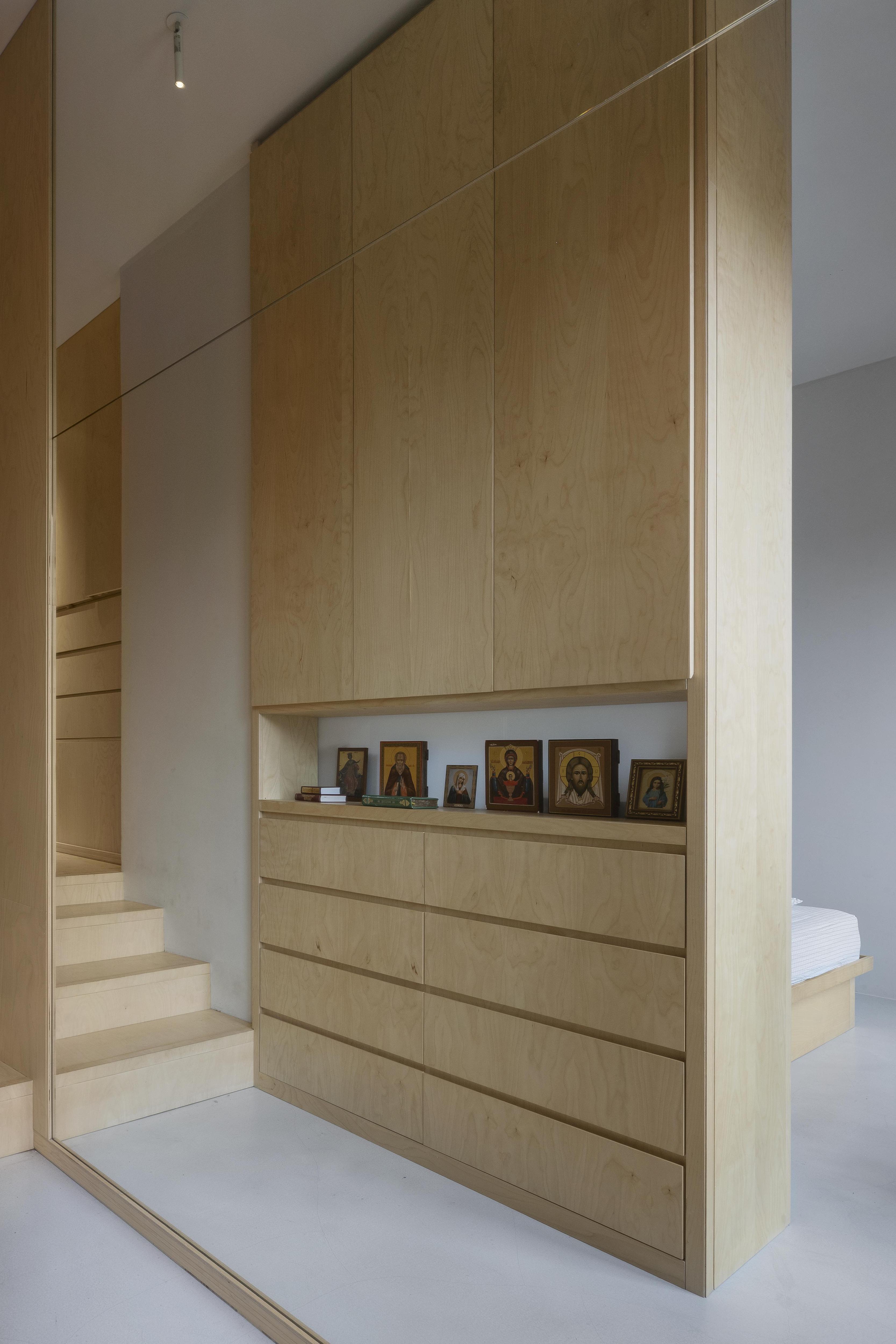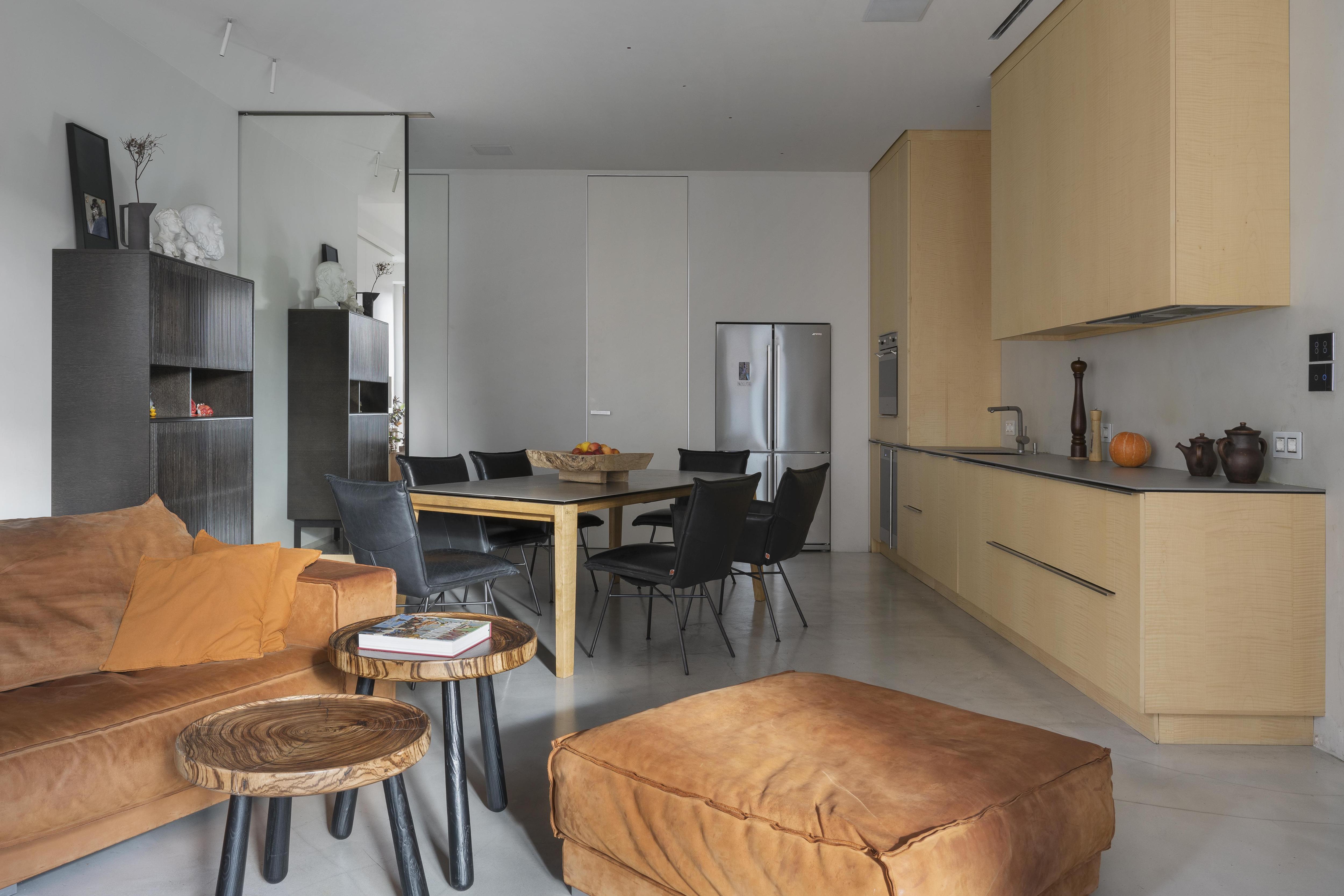 Основная идея проекта — создать впечатление отсутствия дизайна, простого, недорого ремонта. Стены, полы, потолки и двери практически одного светло-серого цвета, на фоне которого выделяется мебель — корпусная из фанеры и шпонированных панелей из японской березы желто-медового оттенка и ярко-оранжевый диван Baxter в гостиной. Фактуры мягко собраны между собой, не выделяются, создавая ощущение уютного минимализма.