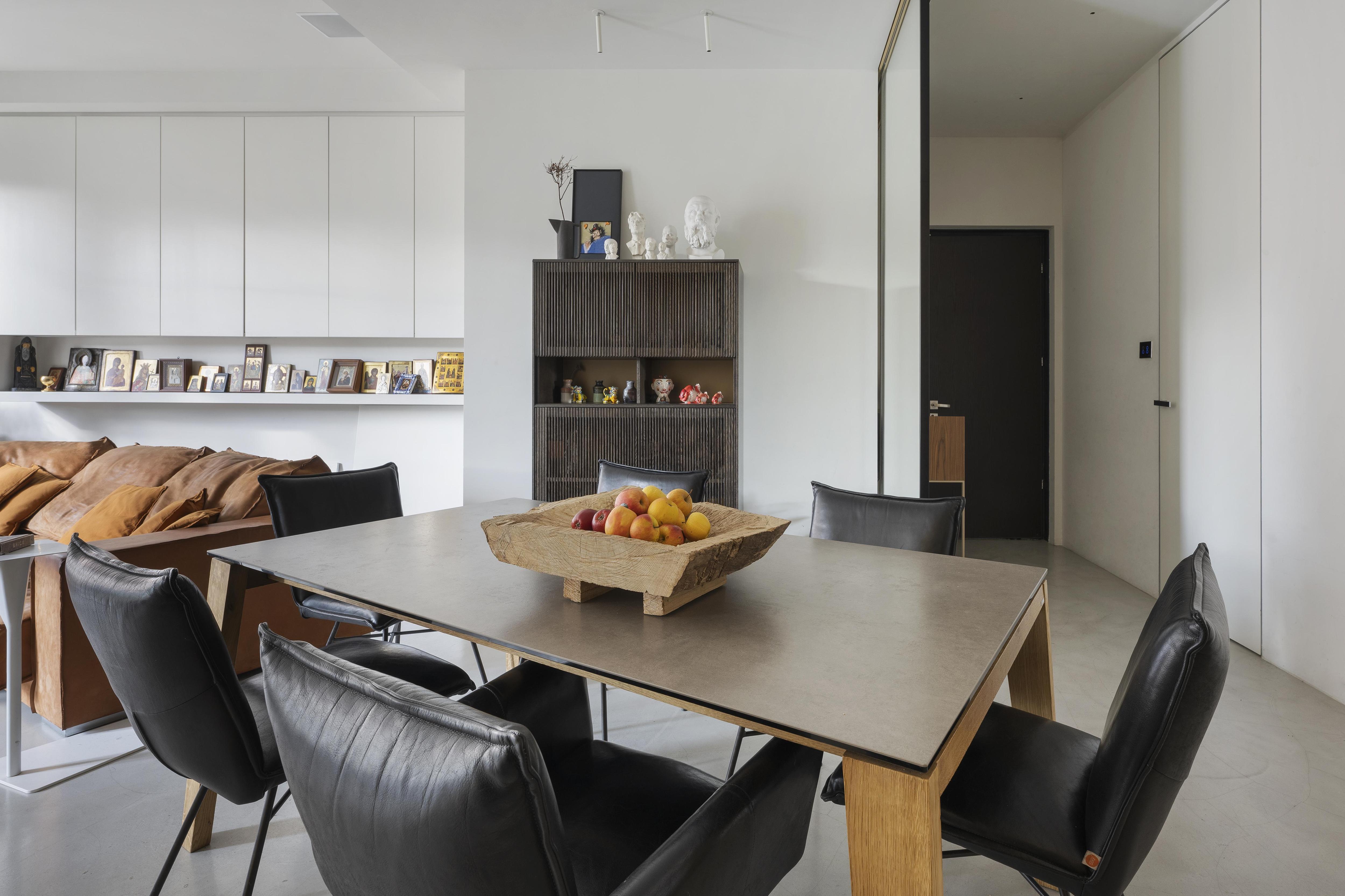 Своеобразную динамику гостиной придает необычное расположение стола и дивана — они находятся под углом, гармонируя с недавно приобретенным специальным шкафом (Punt), где мы храним нашу коллекцию чайников и чаев, привезенных из Китая. Там же — столик Henge и кресло-реклайнер Jori.