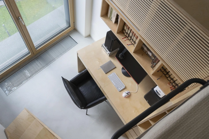 Зона кухни небольшая, но спроектирована так, чтобы поместилось все необходимое для большой семьи. На столешнице получилось сэкономить место: в нее вмонтирована индукционная плита, места нагревания на ней обозначены точками. После готовки плита уже становится частью стола, где можно и резать без доски, и расставлять посуду, не боясь обжечься.