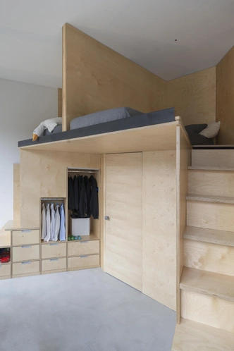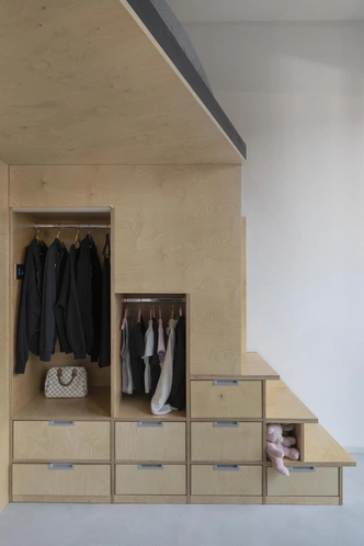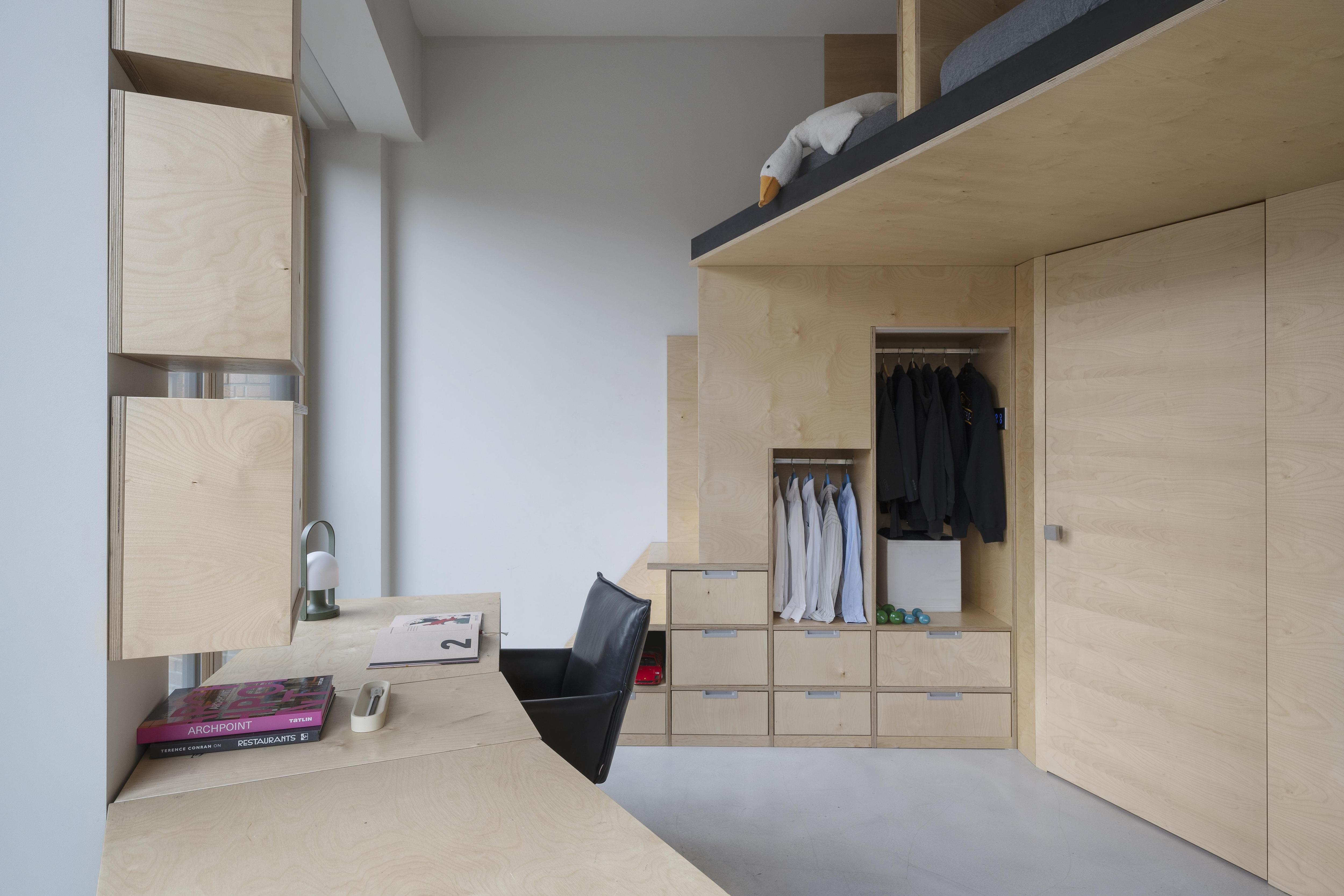 Детские комнаты получились нестандартными, практически треугольными и небольшими, около 9 кв. м. При этом в каждой есть огромное окно в пол, 2 на 3 м. Дополнительная площадь появляется за счет того, что кровати подняты на второй уровень, а под ними — гардероб и система хранения. В одной из детских кровати наверху как бы выведены в пространство коридора — это тоже помогло сделать комнату посвободнее. В мастер-спальне гардероб и кровать тоже представляют собой единое архитектурное решение.