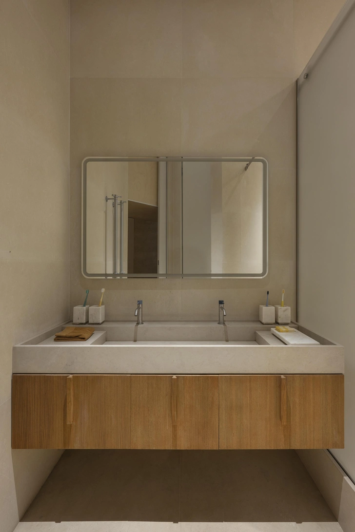 В санузлах стены, раковины, душевые поддоны и полы сделаны из единого материала с ярко выраженной текстурой мрамора бежевого цвета. Сантехника, Laufen. Аксессуары и смесители, СЕА.