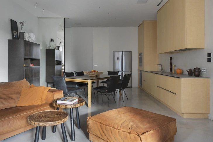 Гостиную и кухню от зоны прихожей отделяет выдвигающееся зеркало 1,5 на 3 метра — при необходимости можно закрыть или, наоборот, открыть, чтобы расширить пространство. У входа в квартиру есть вместительный гардероб, где используется каждый сантиметр.