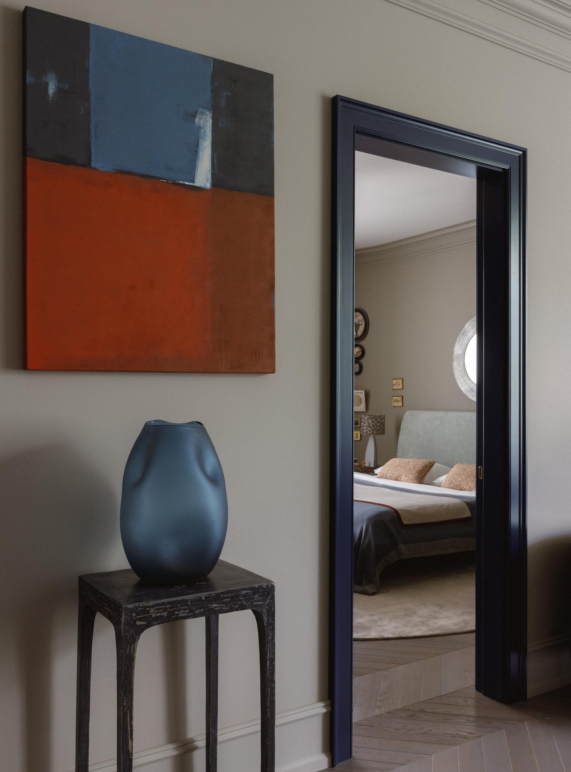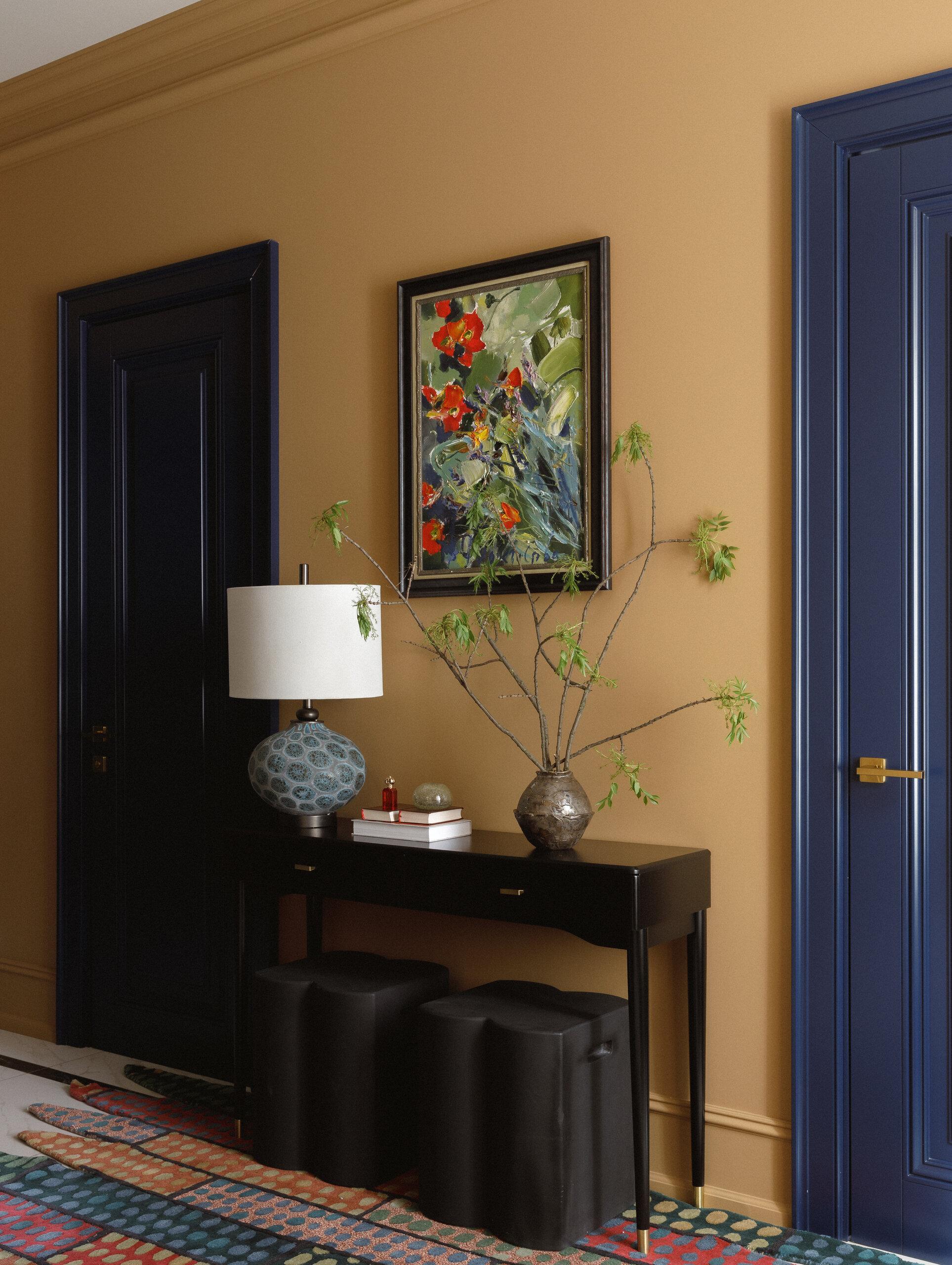 Еще до начала ремонта хозяйка приобрела картину «Маки» художницы Аси Феоктистовой. Это полотно стало отправной точкой для всего проекта: на этапе создания планировки мы сразу решили, что оно займет почетное место над консолью в холле. Картина словно задала тон пространству — ее энергичная, насыщенная цветовая палитра продиктовала выбор оттенков стен и дверей. В итоге именно она стала эмоциональным акцентом интерьера: холл встречает не просто цветом, а настроением.