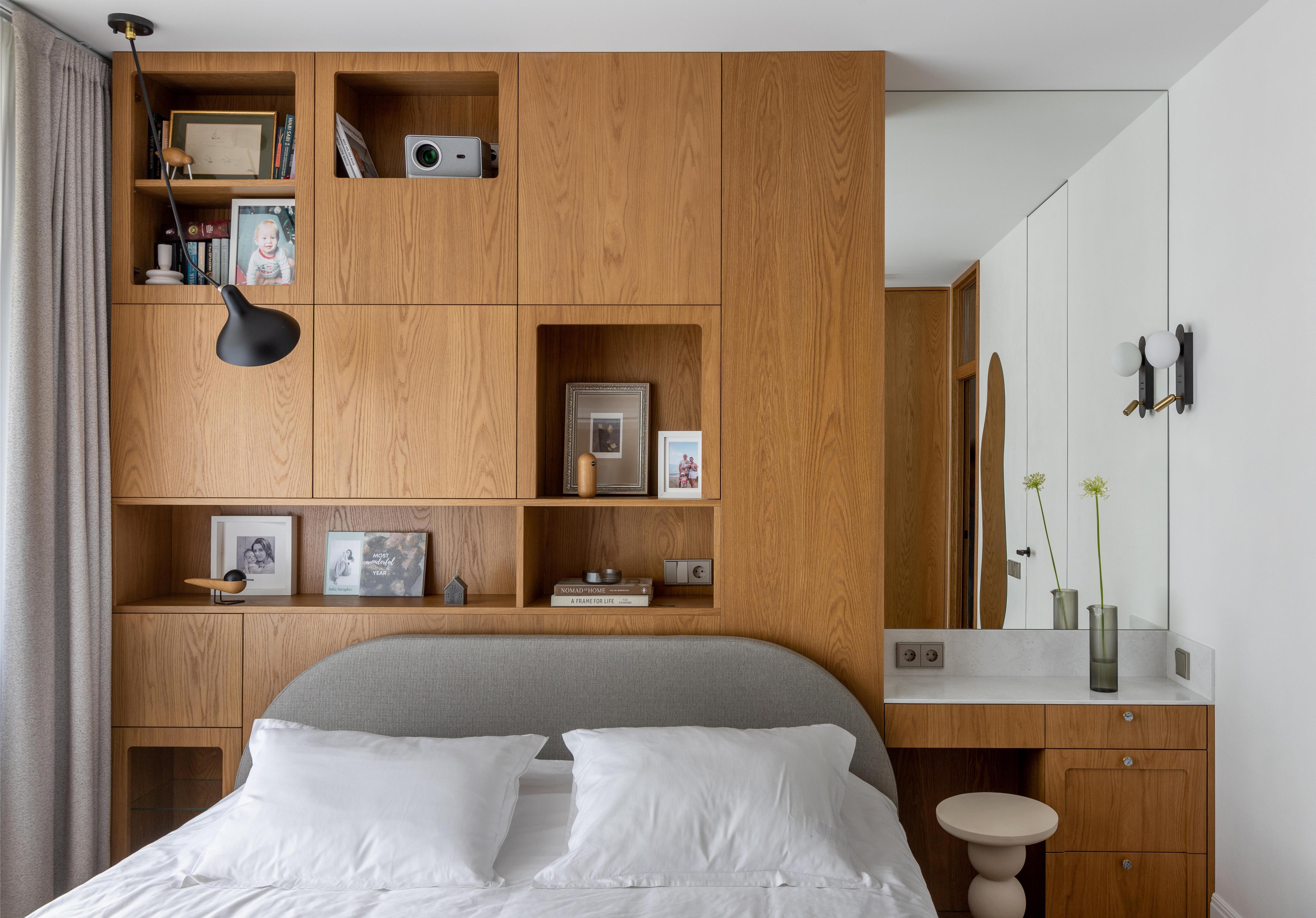 Хранение за изголовьем появилось неслучайно — из-за вентканала не получилось ровной поверхности, поэтому мы скрыли ее за стеллажом из шпона. Здесь есть не только книги и фотографии, но и проектор — лучшее, как мне кажется, решение для спальни.