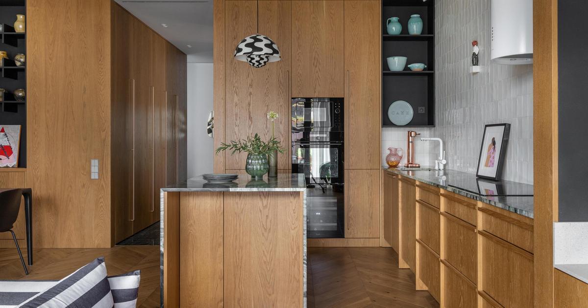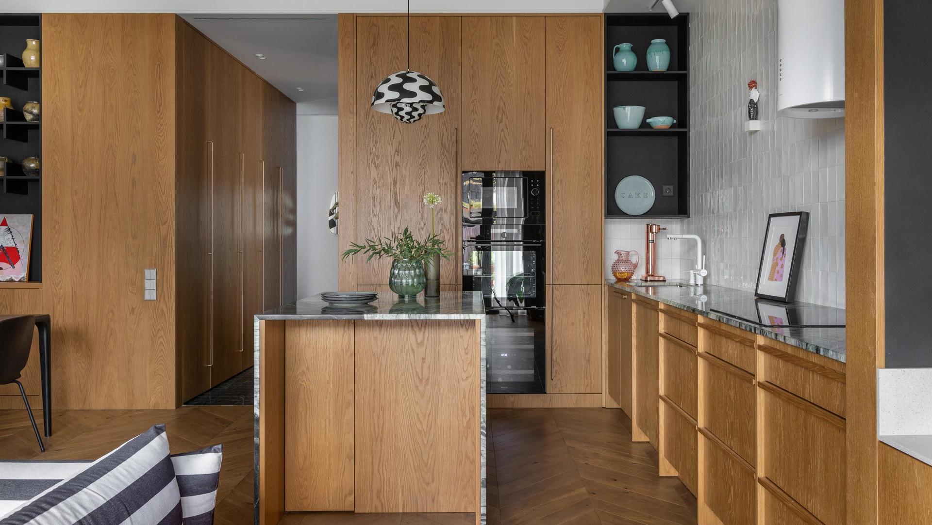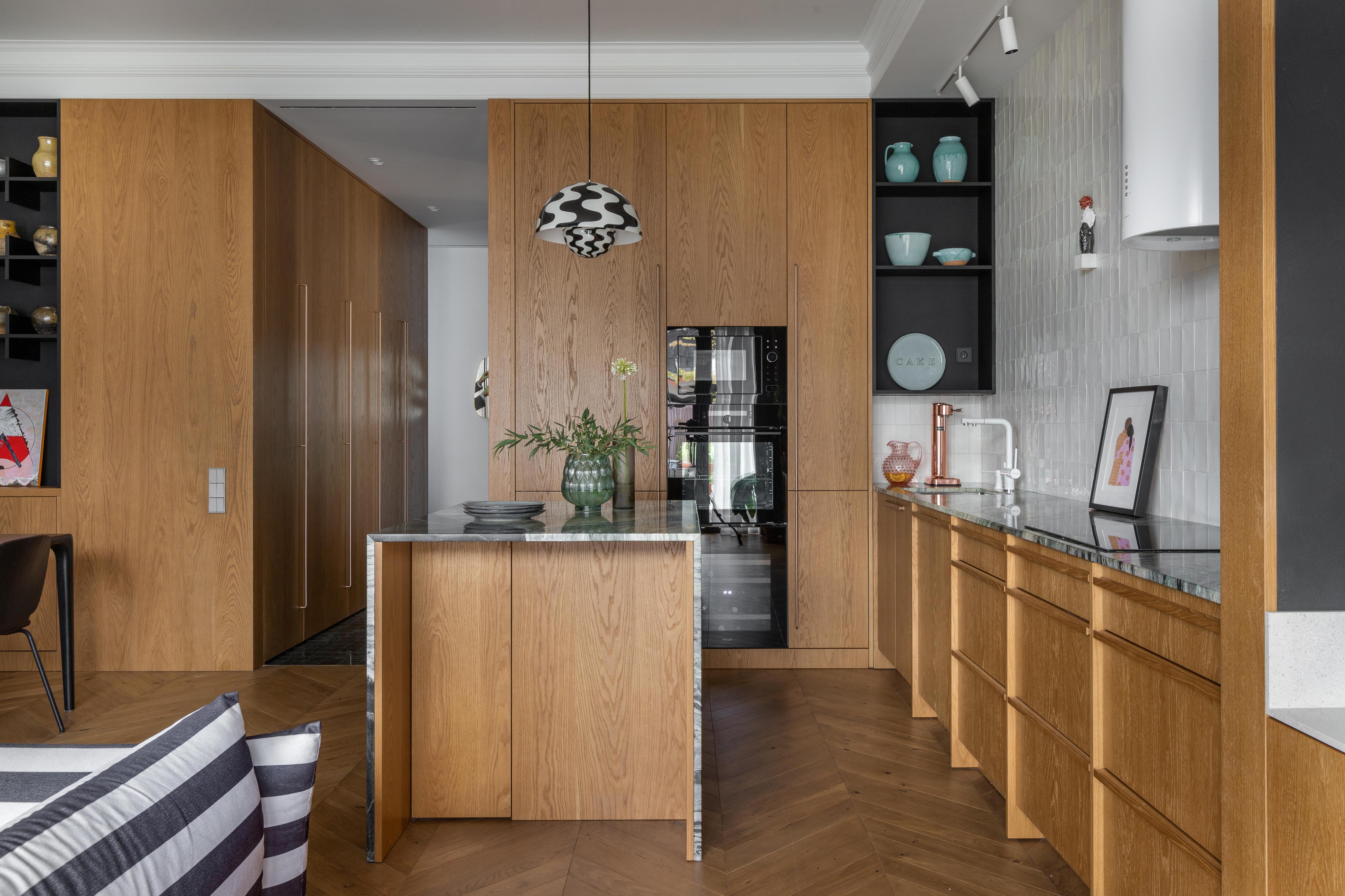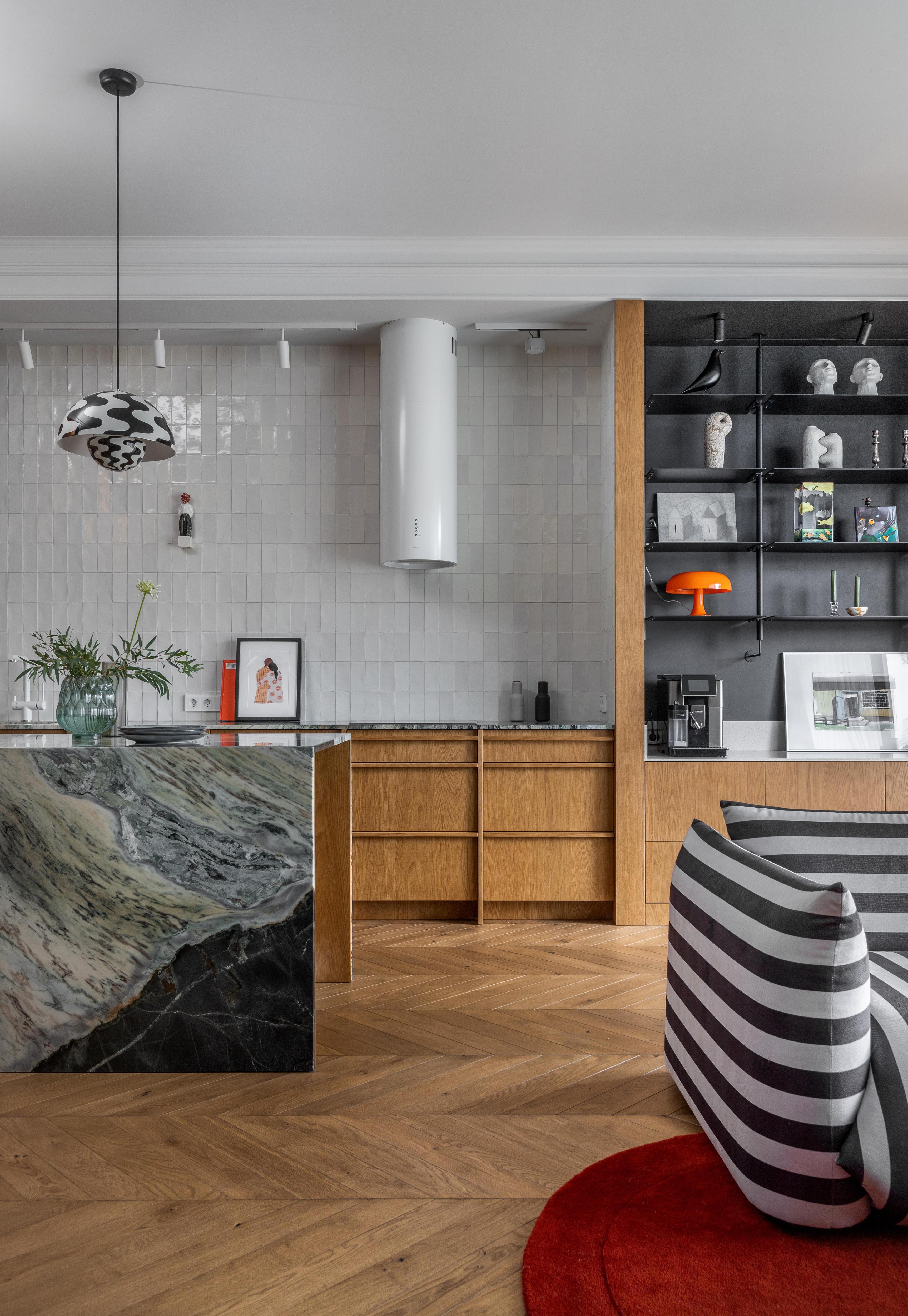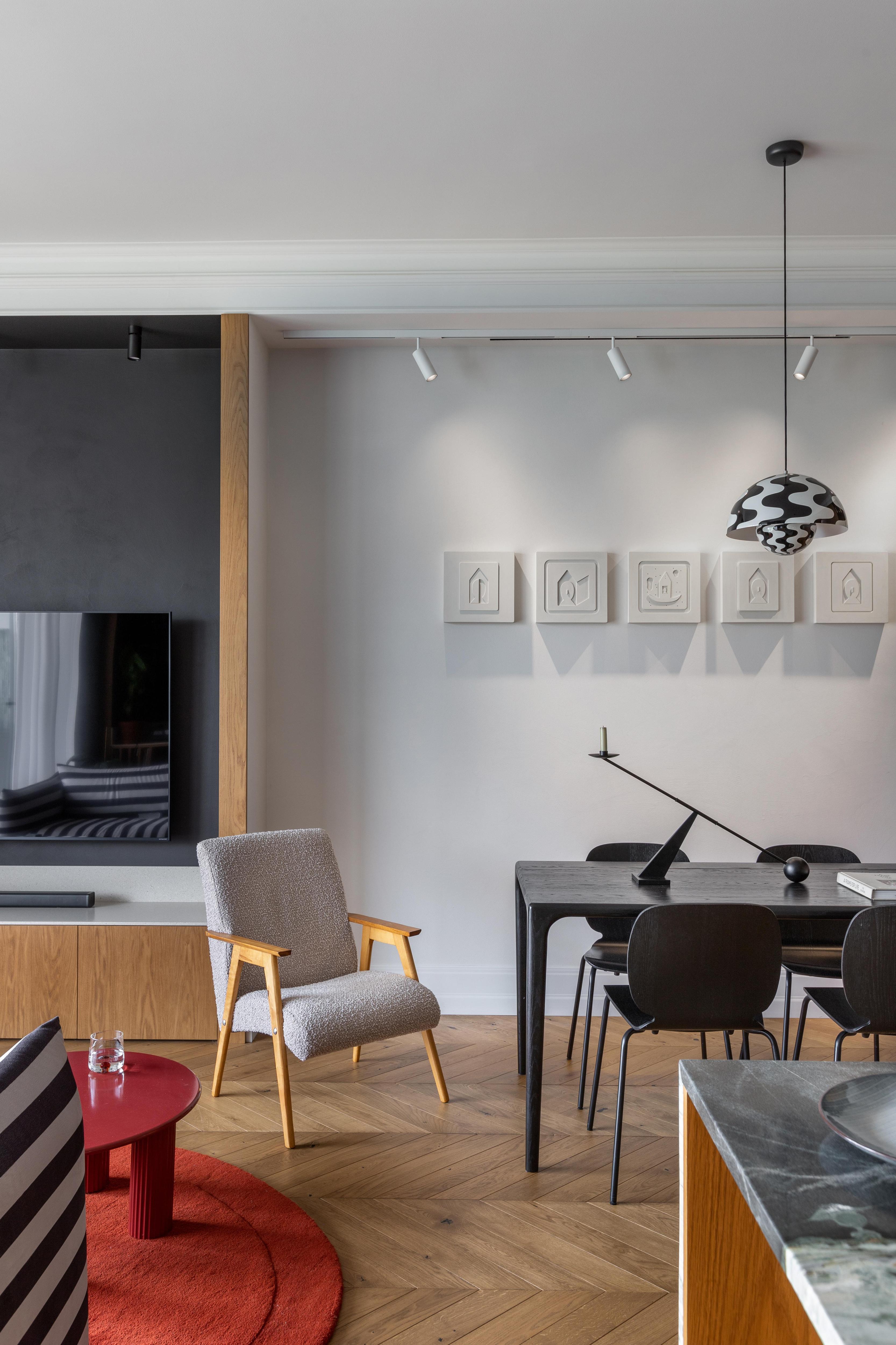 Кухня-гостиная — сердце дома. Мы очень любим проводить здесь время: готовим, ужинаем, смотрим сериалы и мультики, слушаем пластинки, встречаем гостей. Что здесь интересного? Прежде всего, серия небольших работ Александра Балдакова — с верхним освещением они отбрасывают геометричные тени. С ними прекрасно сочетается подсвечник от Audo Copenhagen — моя мечта, подарок любимой строительной команды на 8 марта.