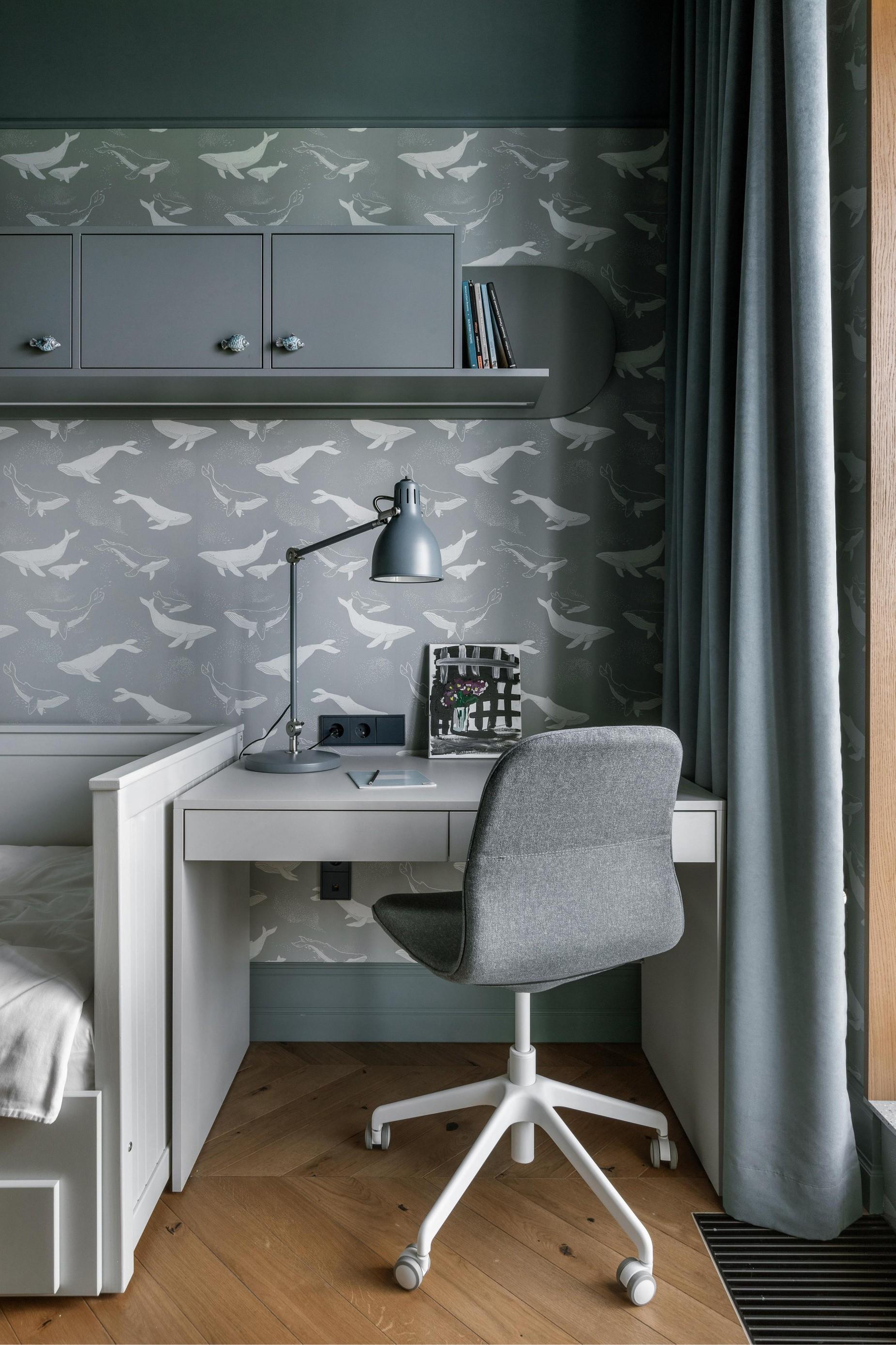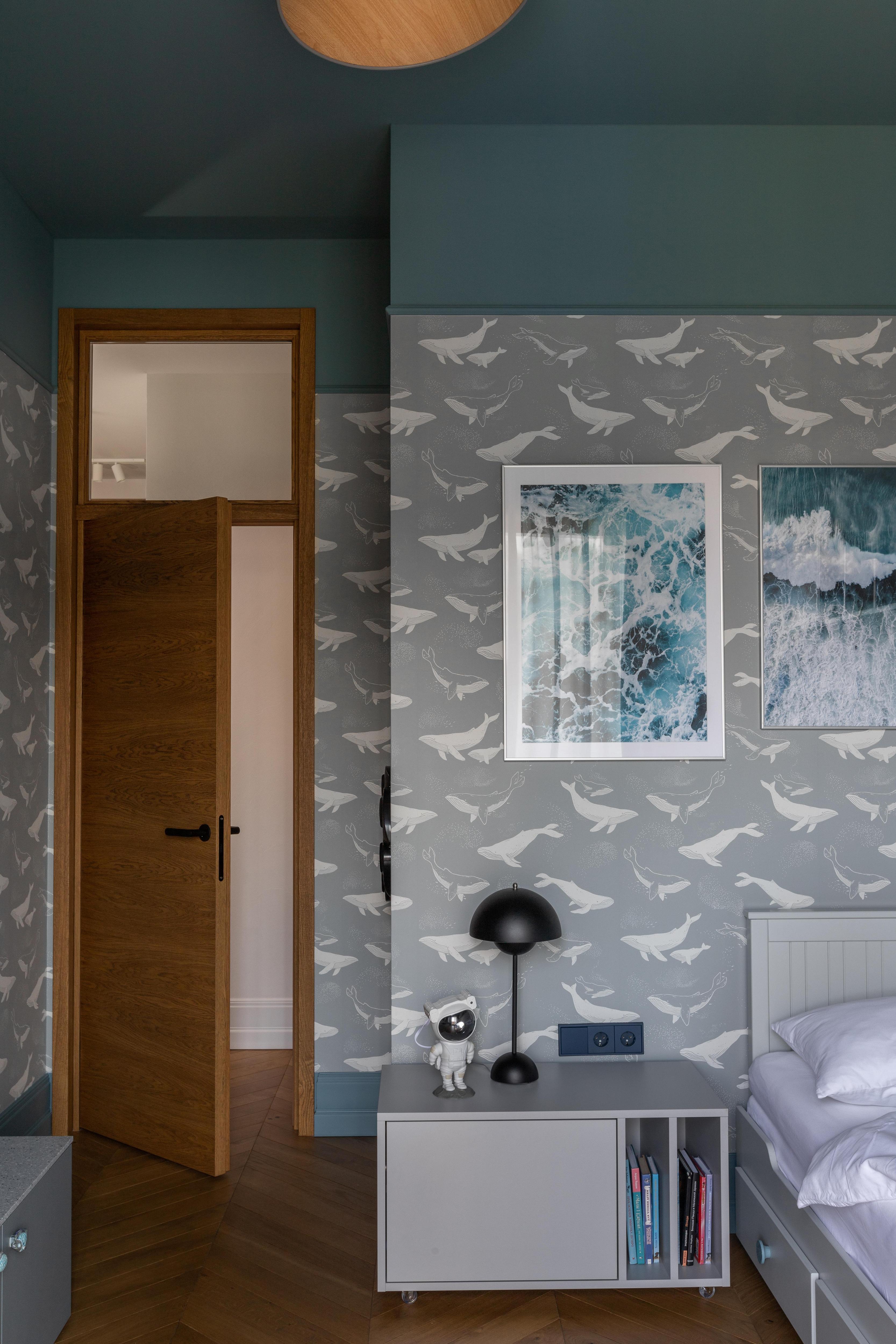 У детей — сына и дочки — отдельные комнаты. Заказчики сразу предъявили маме-дизайнеру четкое ТЗ: дочь хотела цветы и свой любимый фиолетовый цвет, а сын — голубую палитру и рыбок. Я постаралась, чтобы все были довольны!
