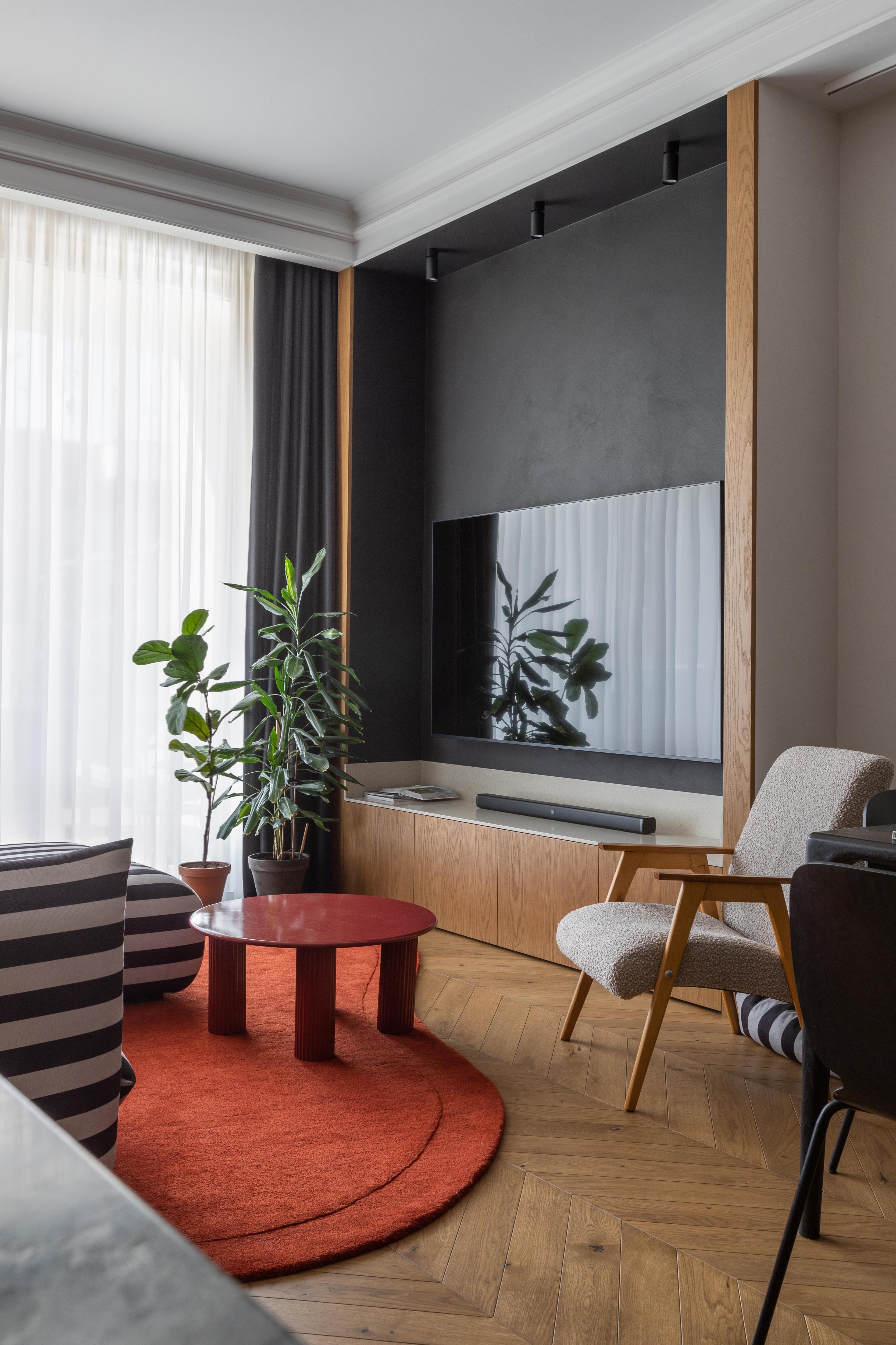 Прекрасный полосатый диван в гостиной изготовили наши партнеры Mebel in Home, а кресла — мое ценное наследство от бабушки. Когда ее не стало и дом начали освобождать для продажи, я забрала их себе на память. Они 1960-х годов, так что мы перетянули подушки и покрыли дерево лаком. Они уже не в первый раз переезжают вместе с нами.