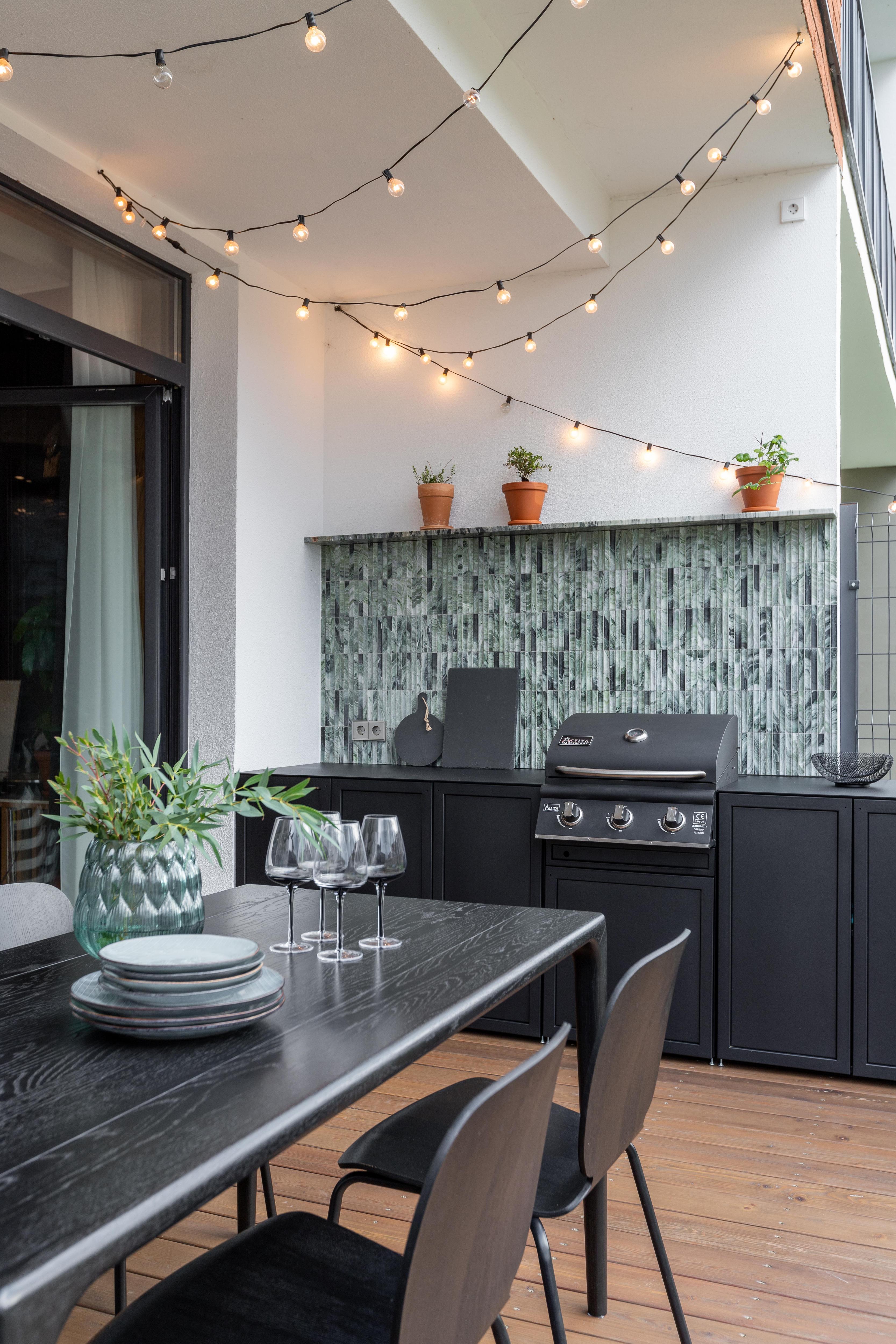 Теперь про наш участок. Он меньше сотки, но мы этому очень рады! Нам этого достаточно — мы не любим тратить время на уход, но очень приятно иметь свой кусочек земли с деревьями, куда можно выйти босиком. Здесь мы обустроили террасу с уличной кухней и газовым грилем, газоном, грядками и местом для бассейна летом. Зимой на его месте будут несколько кресел и кострище.