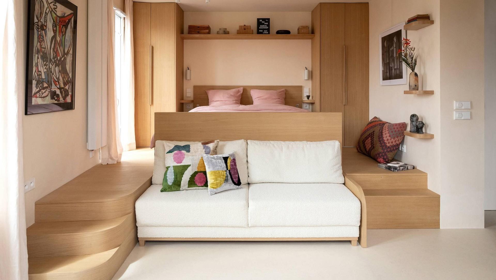 В глубине студии установили подиум, где находится кровать и раскладной диван. Скрытый отсек в каркасе кровати позволяет использовать это пространство для хранения вещей.