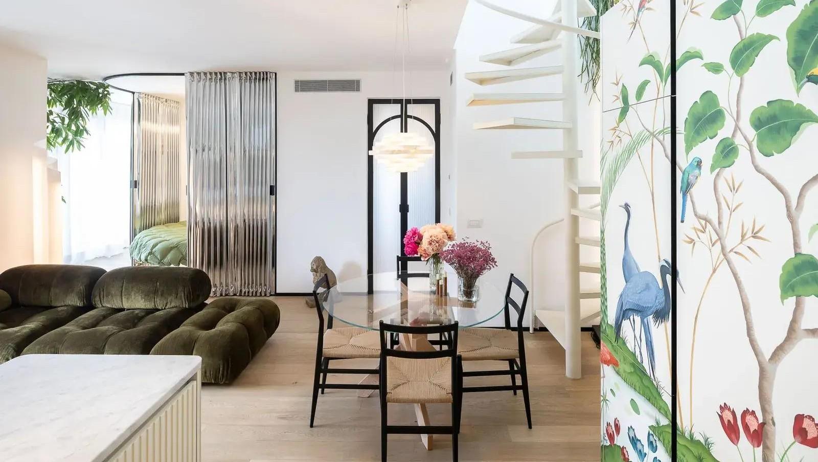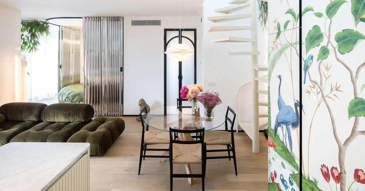 В этом дуплексе много интересных (и эклектичных) решений. Дизайн 1980-х годов сочетается здесь с работами современных авторов, и это смотрится органично, но вот самое странное — это обои от Osborne & Little, на которых изображен сад с птицами. Они встречают гостей в прихожей и продолжаются в гостиной. Выглядят они, действительно, неожиданно, даже слегка по-детски на фоне черных графичных акцентов и перегородки с серебрисыми шторами.