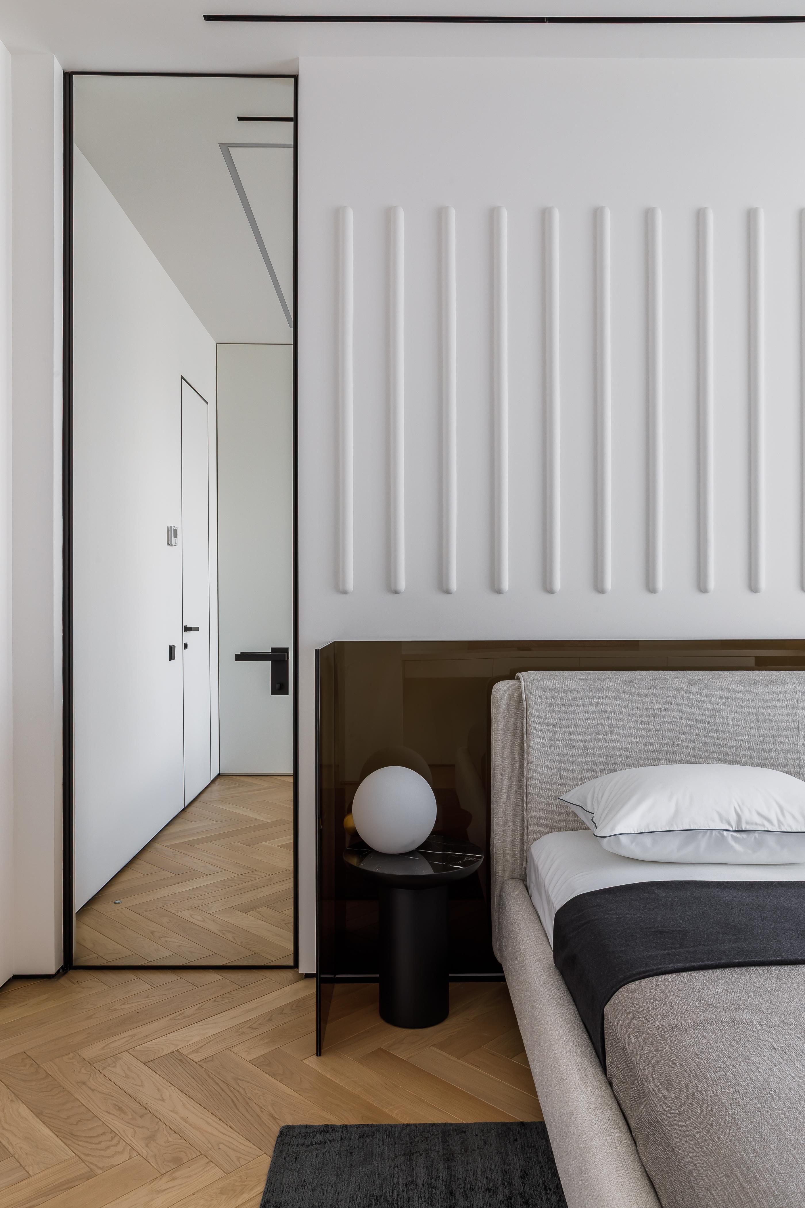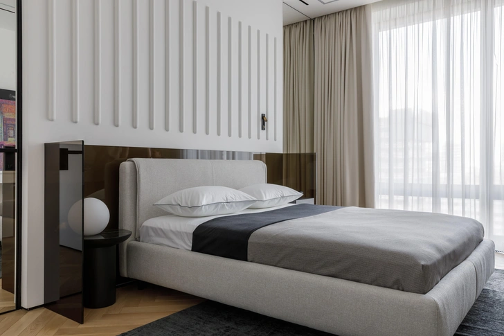 Хочется еще раз заметить изделия из коричневого стекла, они есть почти в каждой зоне. Но особенно мы гордимся изголовьем в спальне! На первый взгляд — это просто тонированное стекло, но за ним стоит более сложная работа. Нас не устроил вариант сделать просто стекло, нам важен был эффект, то, как красиво в нем рассеивается подсветка за кроватью. Поэтому мы увеличили его толщину, взяв два листа, а между ними запечатали градиент. В проекте было много таких интересных и сложных задач, так что мы убедились в том, что для нас нет ничего невозможного!