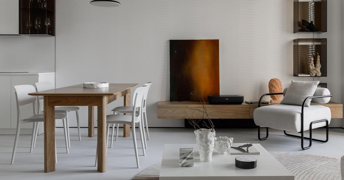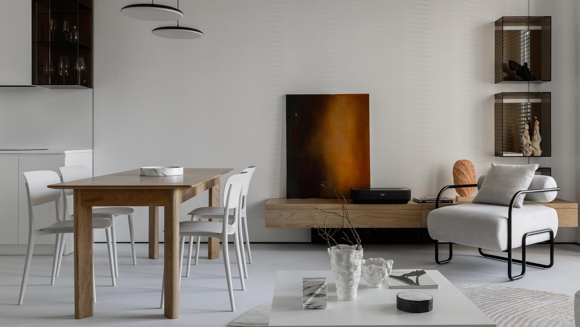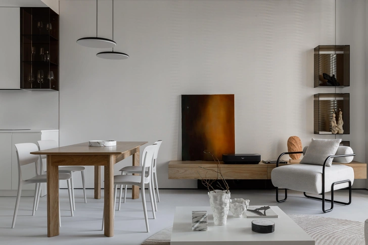 Cтулья, Calligaris. Стол, Artwood. Фарфоровые вазы на журнальном столике, Екатерина Пеганова. Мраморные предметы, картина, Izzi Decor. Скульптура из мраморной мозаики на консоли, Юлия Горбунова. Скульптуры на стеклянных полках, Елена Троянская. Кресло, AspectStore.