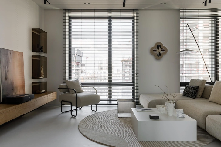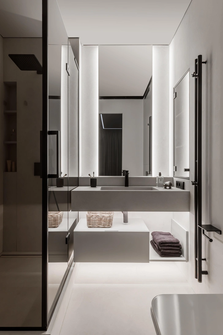 По стилю и правда было непросто. Мы начинали с ярких идей и необычных арт-объектов, а пришли к монохрому и лаконичным, но запоминающимся приемам — например, акценты из коричневого стекла в разных зонах и деталях. Или корпусная мебель: она у нас в цвет стен, но внутри — яркого кораллового цвета. Когда человек хочет все нейтральное, но при этом иногда скучает по цвету, мы стараемся найти компромиссное решение. По задумке, мебель должна была быть незаметной, так что мы долго искали тот самый бежевый оттенок. Микроцемент на полу и потолок в цвет стен помогли сделать пространство целостным — большим холстом для интересных акцентов.