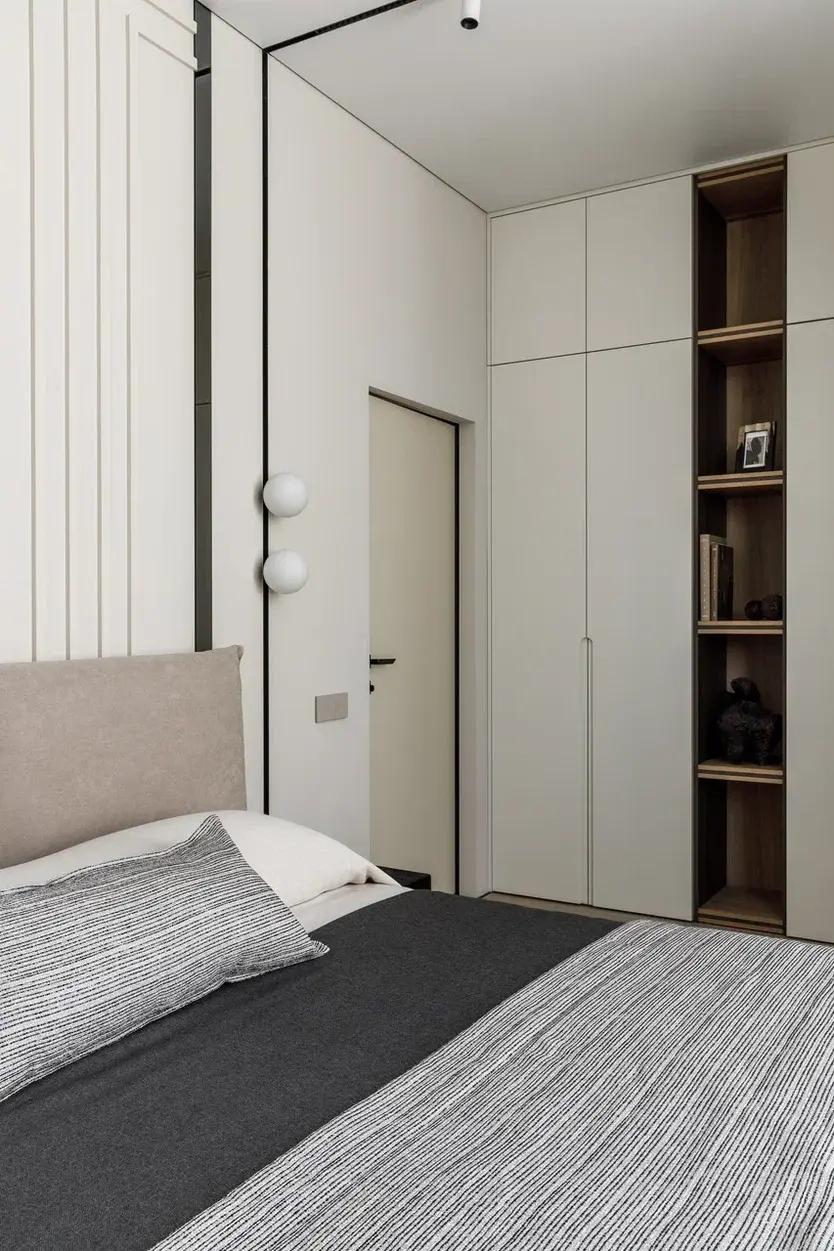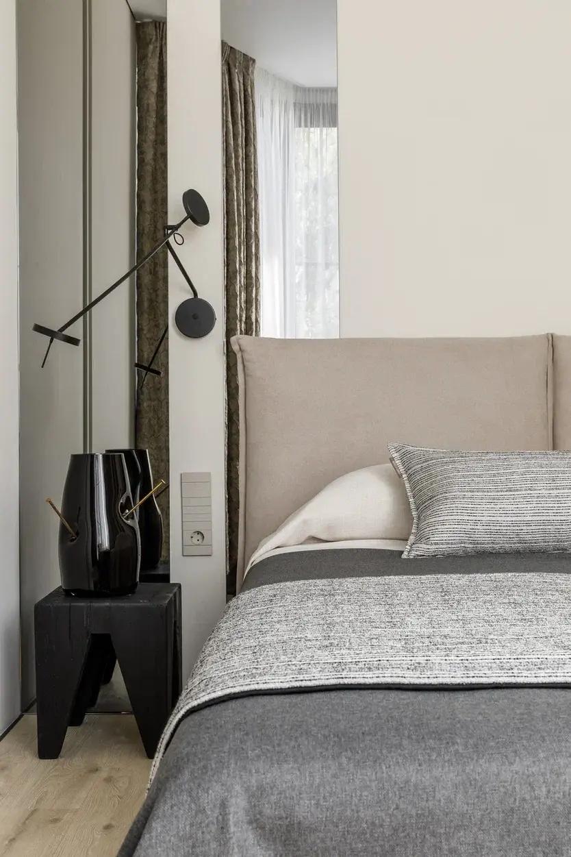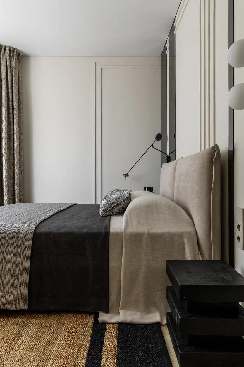 «В спальне мы создали камерную атмосферу, используя натуральные ткани и приглушенное освещение. Здесь, как и во всей квартире, доминируют спокойные бежевые оттенки и природные материалы».
