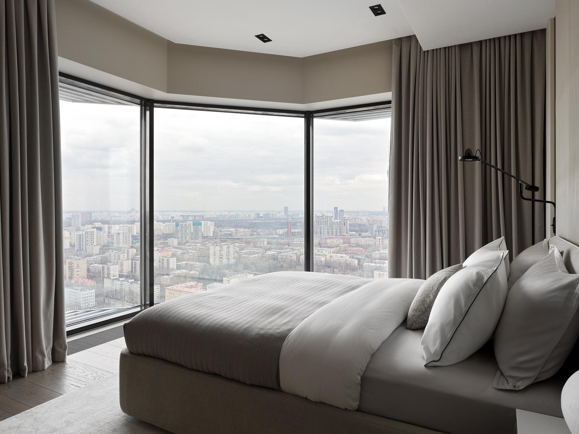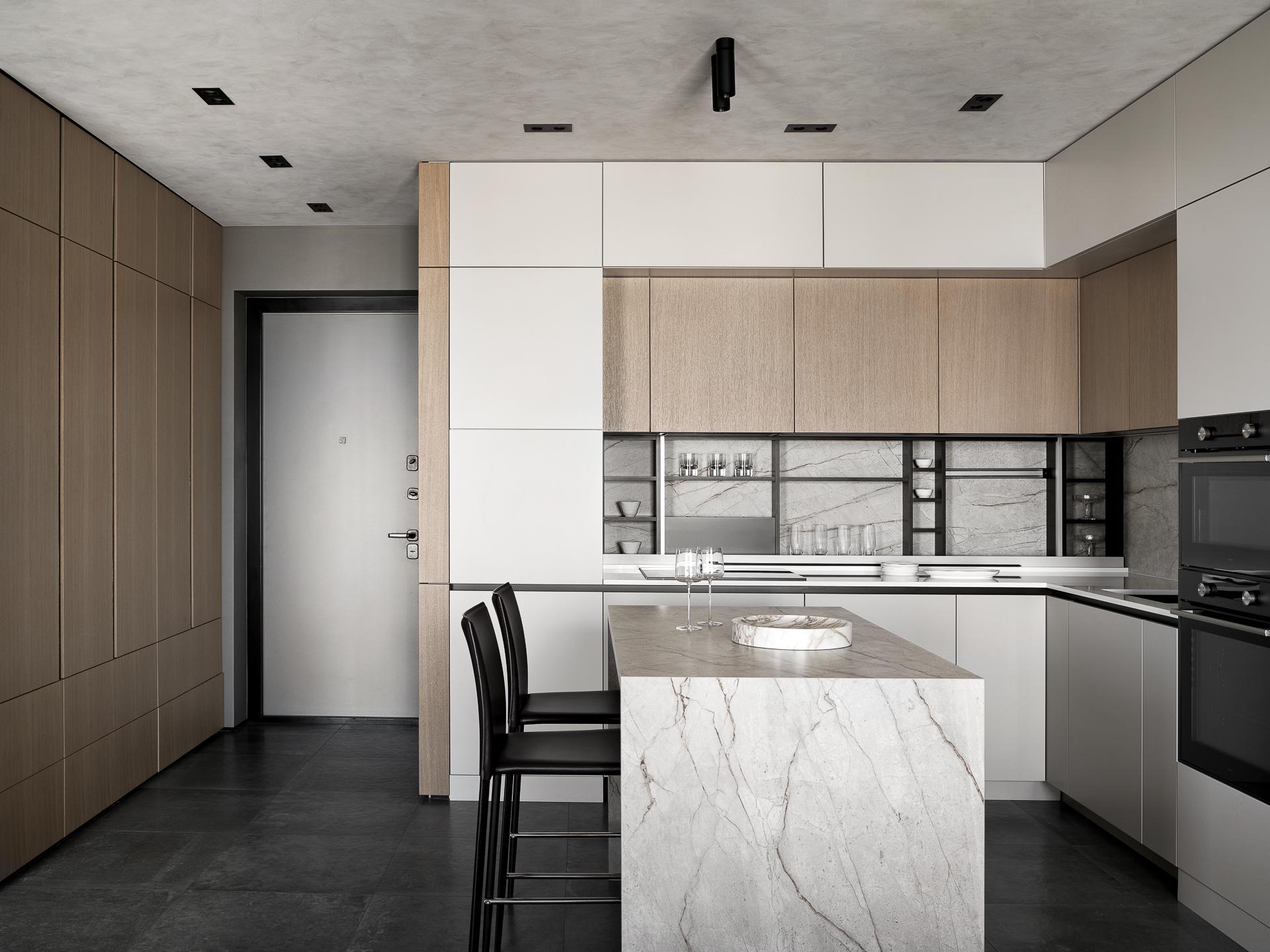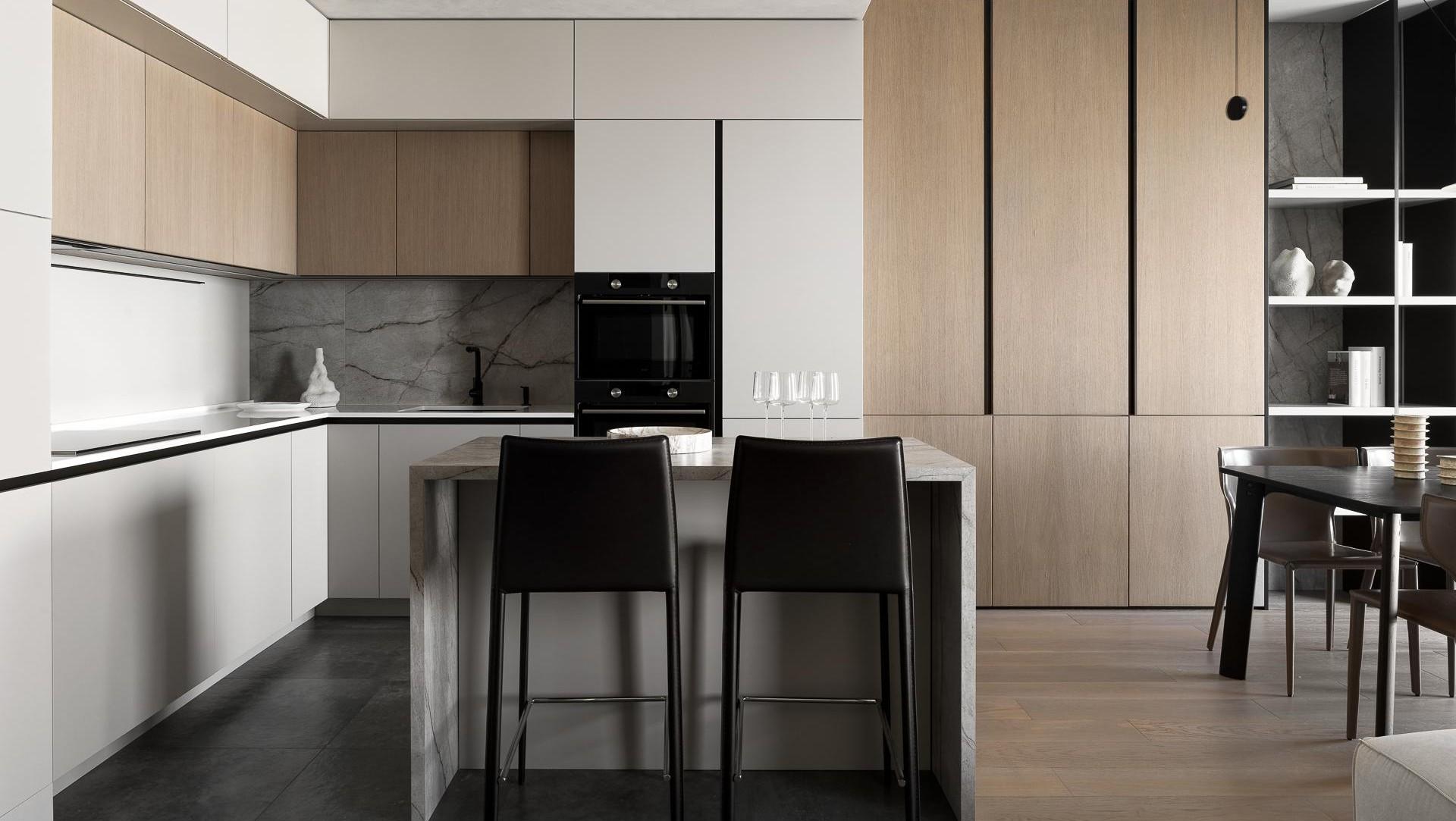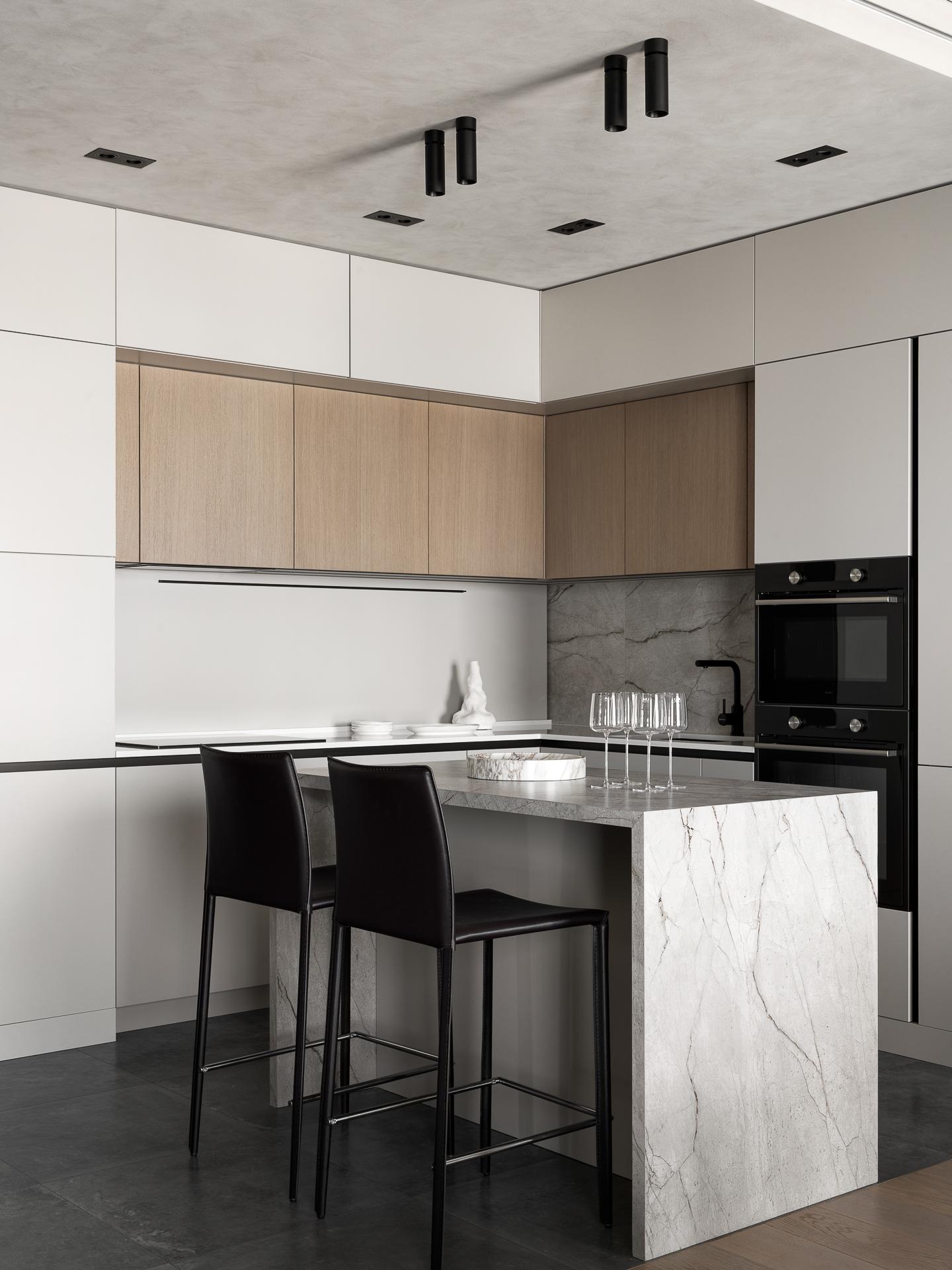 В общей зоне стоит обратить внимание на Г-образный кухонный гарнитур с продуманным функционалом: хранение скрыто за подвижным фартуком, предусмотрено место паркинга техники и много хранения, которое очень важно для наших клиентов — они любят готовить. Отдельно стоящий остров с вместительной системой хранения и графичными стульями дополняет и уравновешивает композицию кухни. Вся встроенная техника выбрана у шведского бренда ASKO — она полностью интегрирована в гарнитур и не нарушает цельности интерьера.