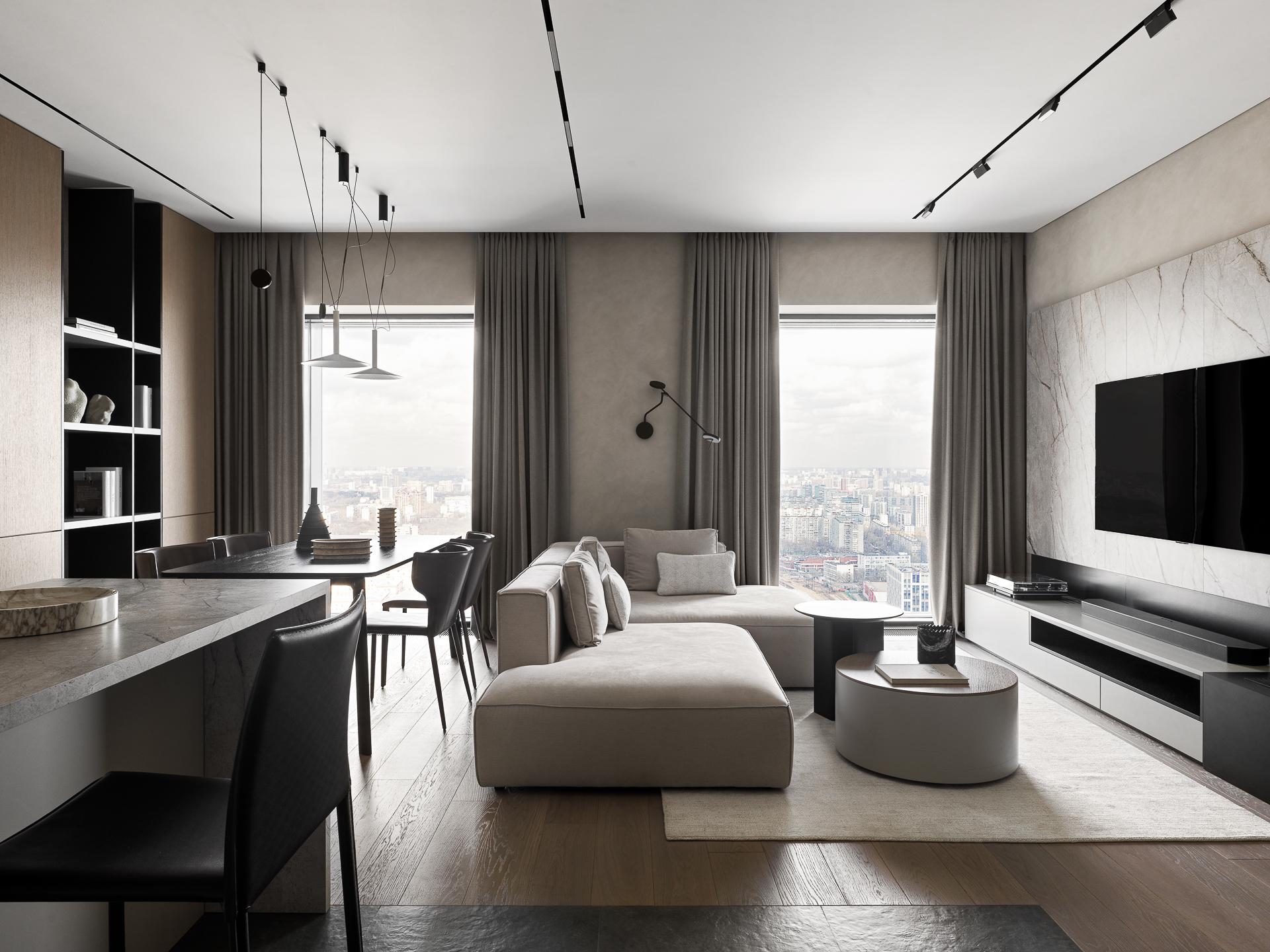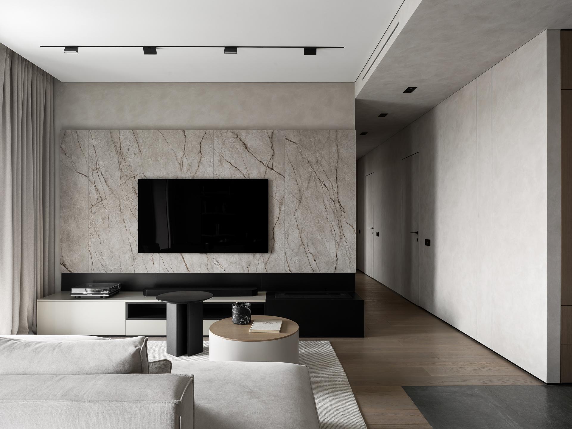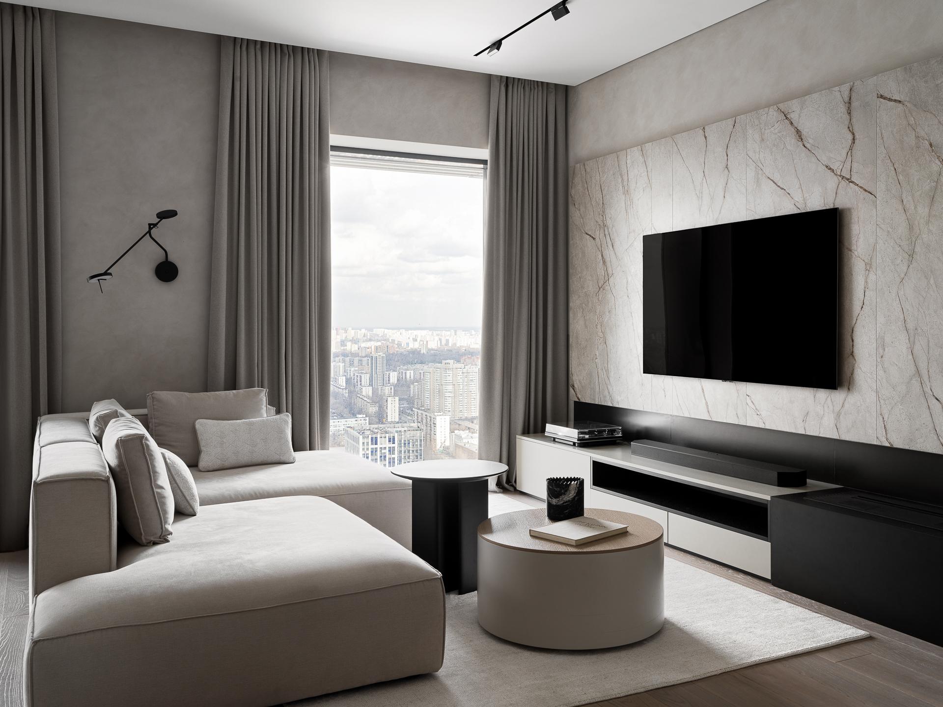 Интерьер создавался для семейной пары с ребенком и котом. На первой встрече заказчики обозначили ключевые пожелания: они хотели современный функциональный интерьер, выдержанный в нейтральной гамме, который будет комфортным для жизни и не будет перегружен декоративными элементами. Еще из обязательных пунктов в списке был биокамин в зоне ТВ и интегрированный в шкаф санузла туалет для кота.