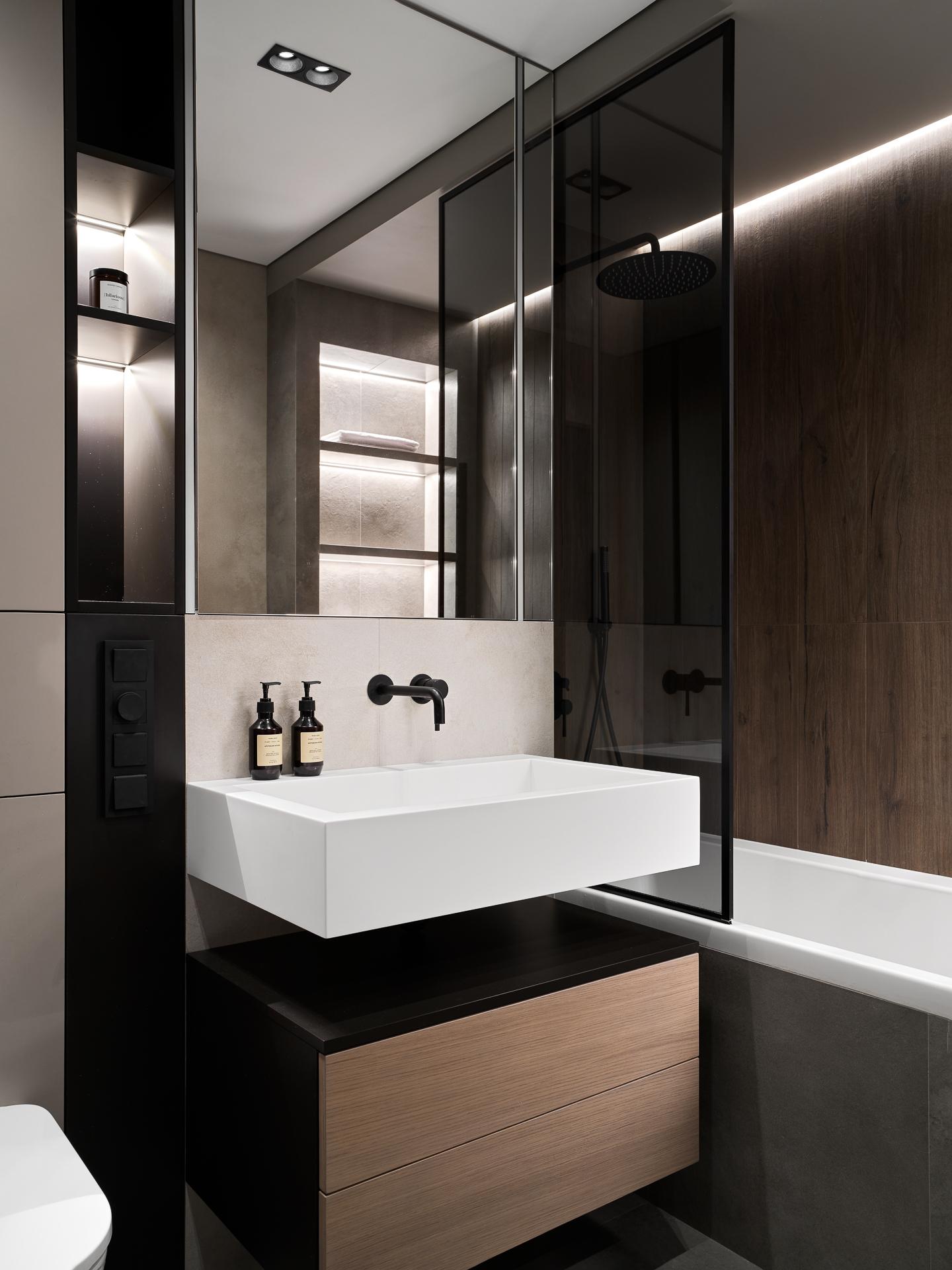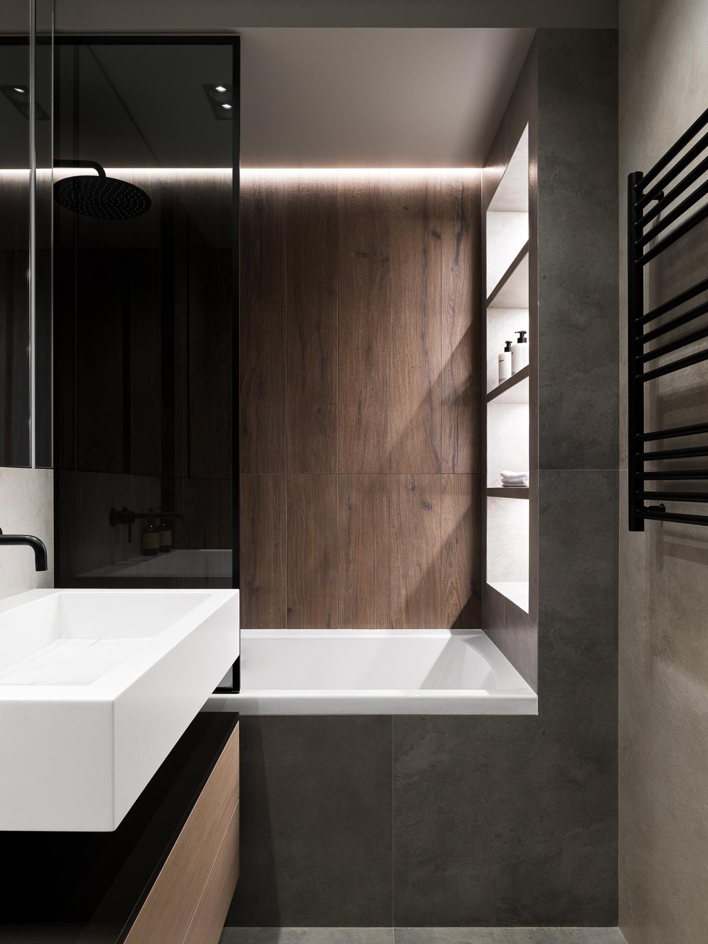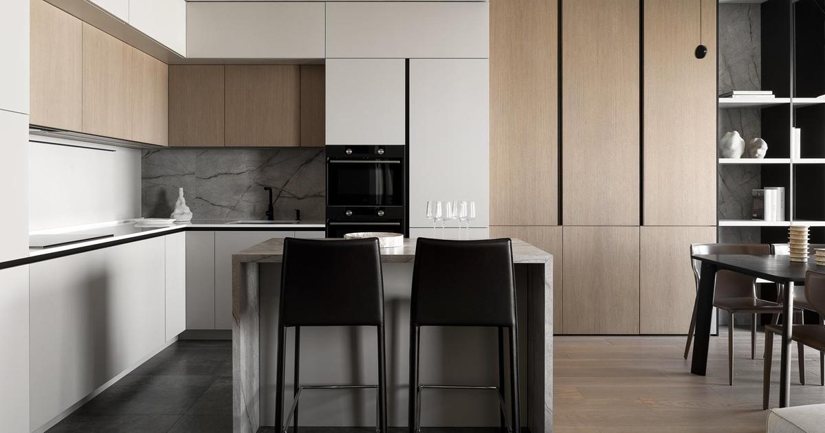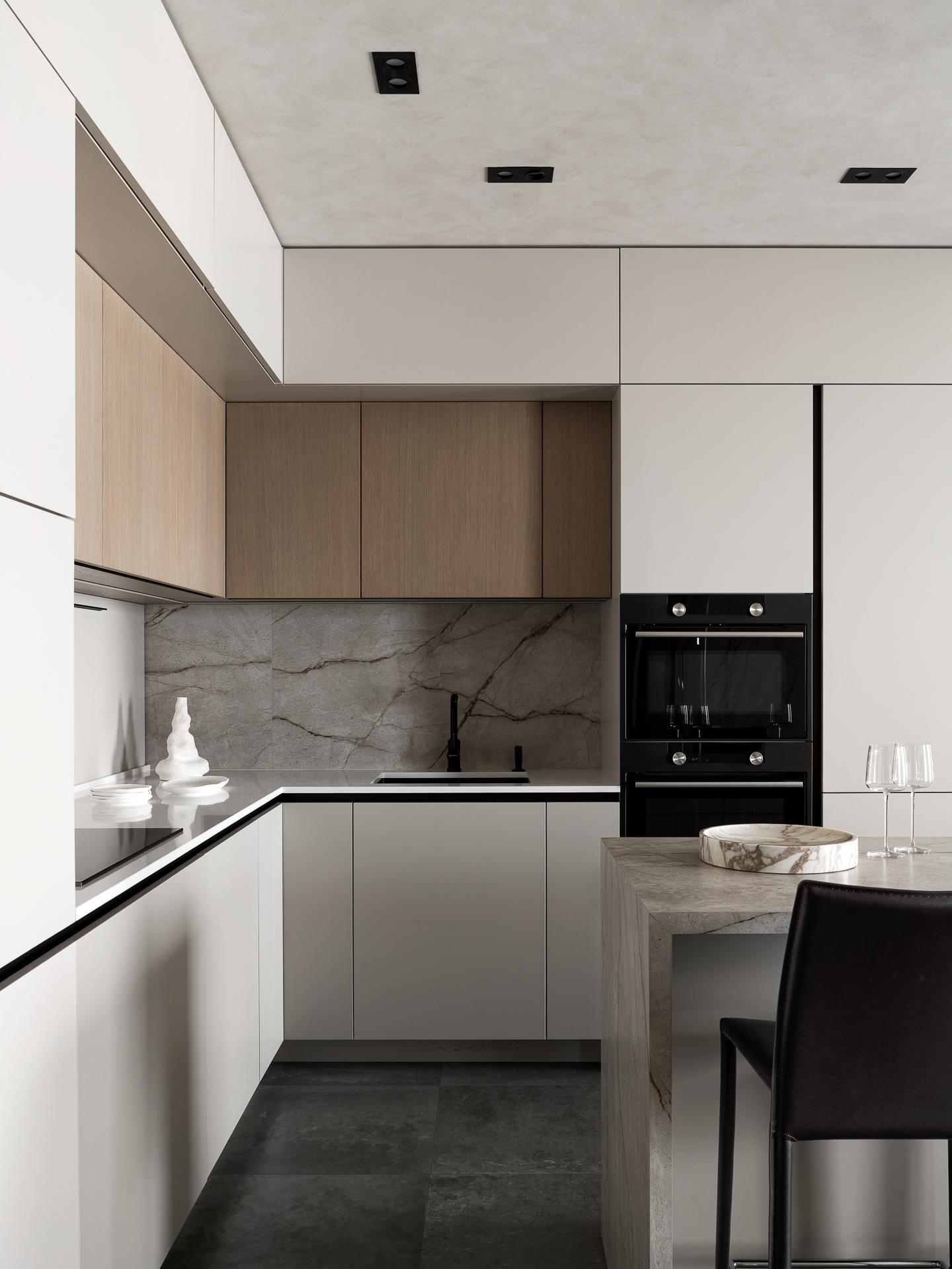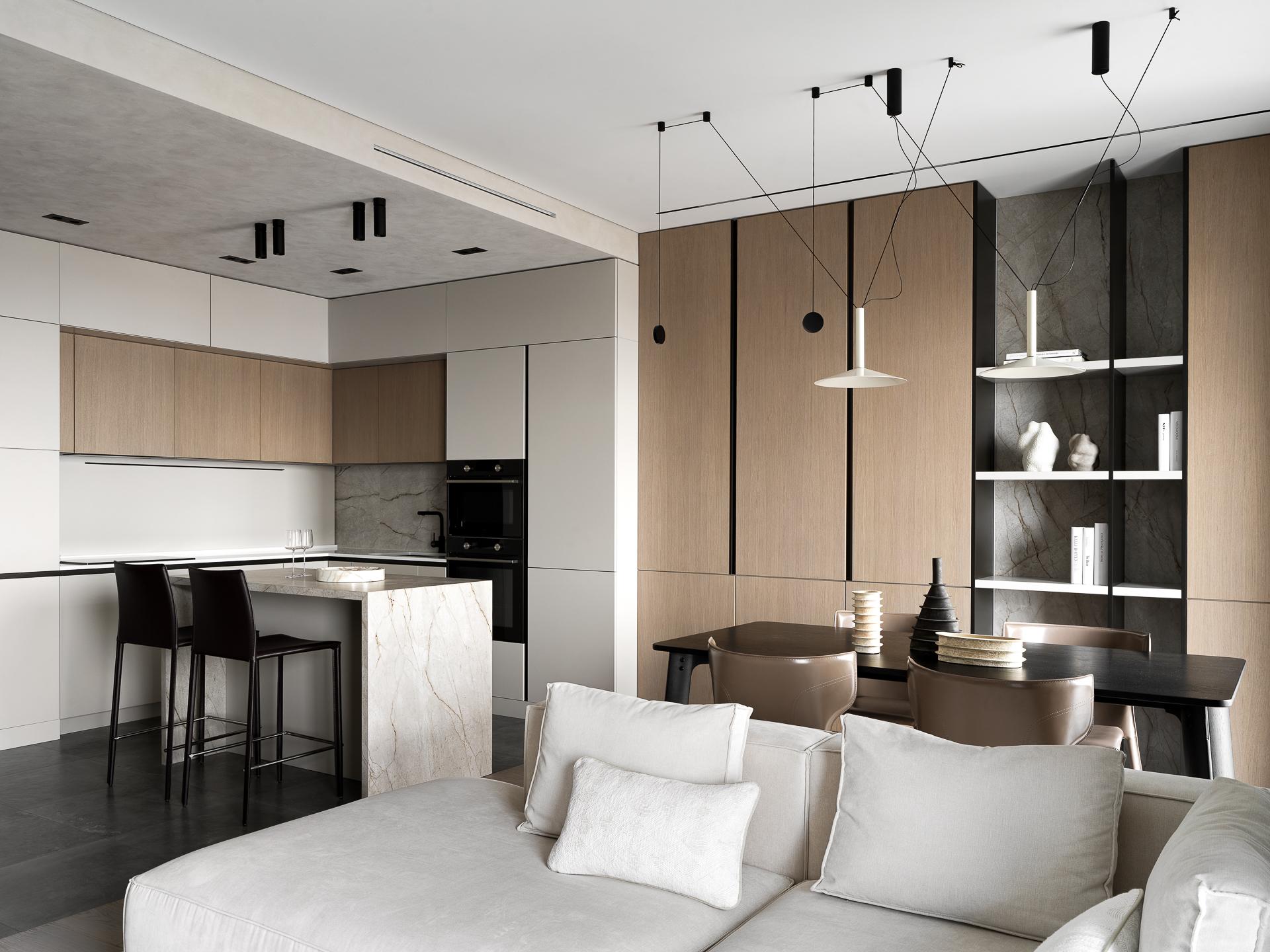 Цветовая гамма построена на нейтральных оттенках, дополненных теплым деревом и разнообразными текстурами, которые добавляют глубину и динамику.