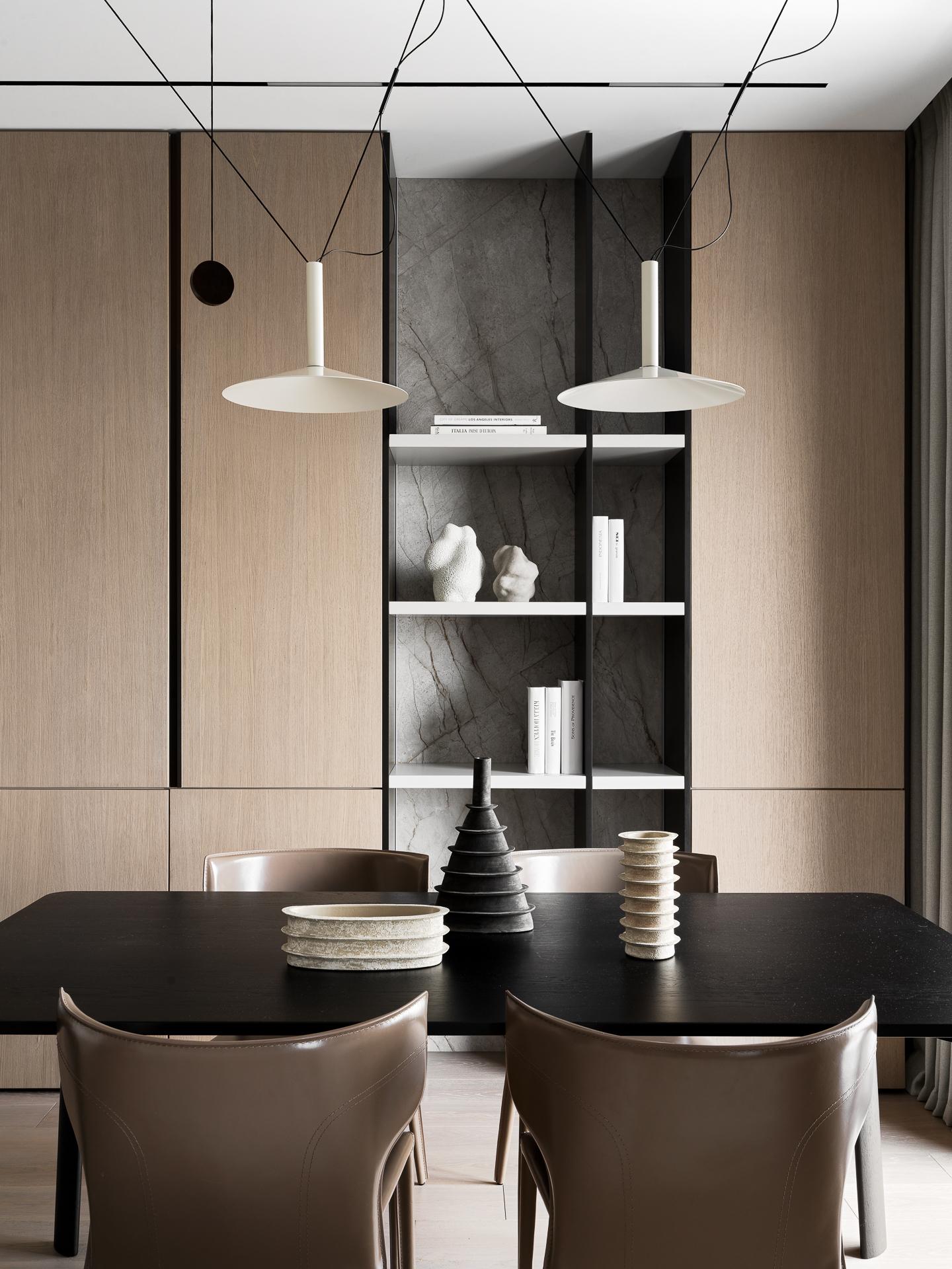 Над столовой зоной — подвесные светильники Marset, задающие легкий ритм.