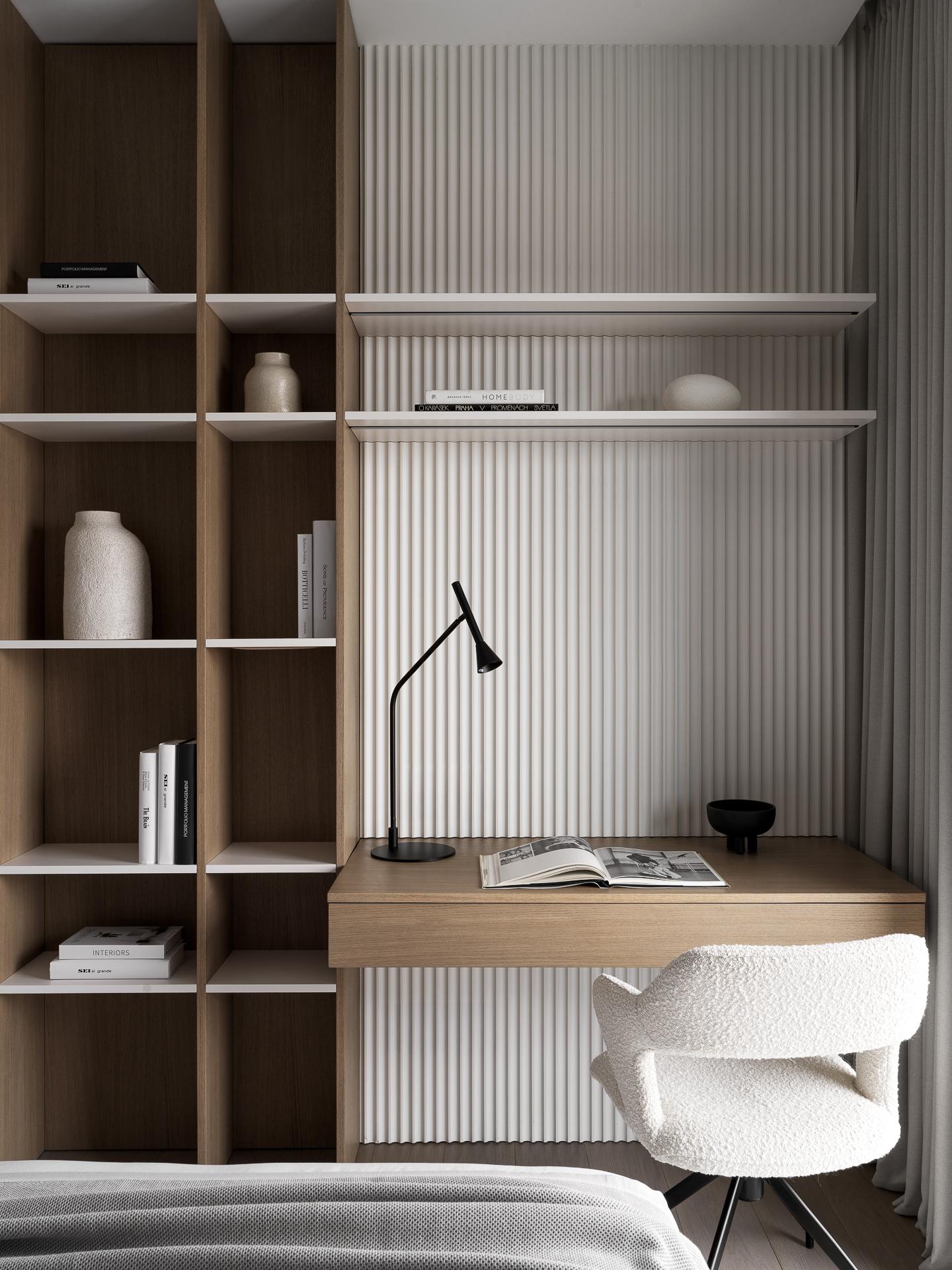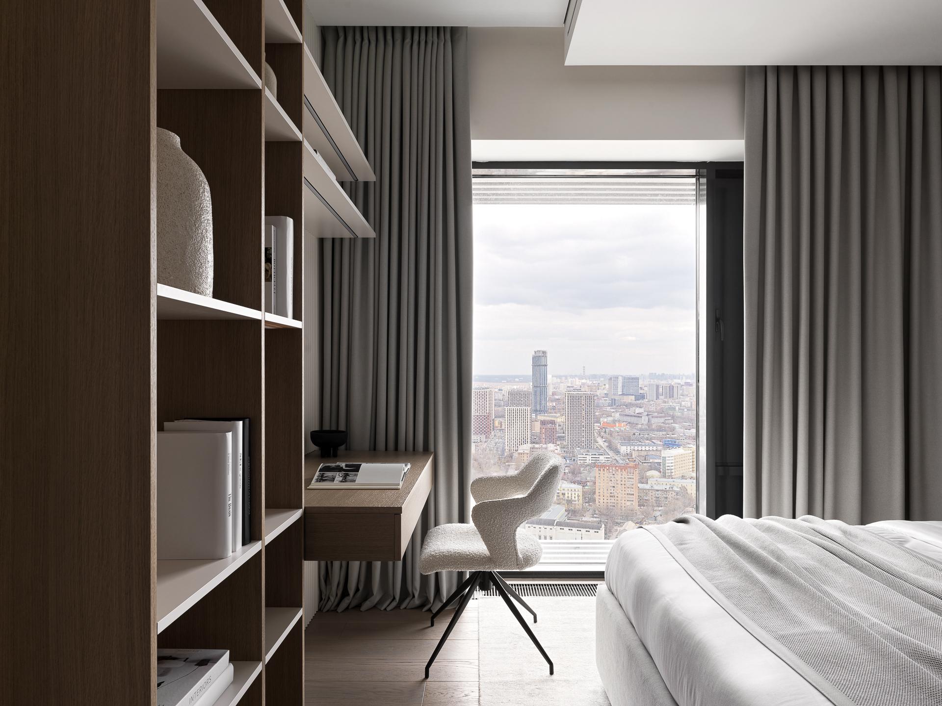 В кабинете — универсальное рабочее пространство: стол расположен прямо у окна с видом на город, а компьютер спрятан за складной дверью в стеллаже — при надобности ее можно открыть.
