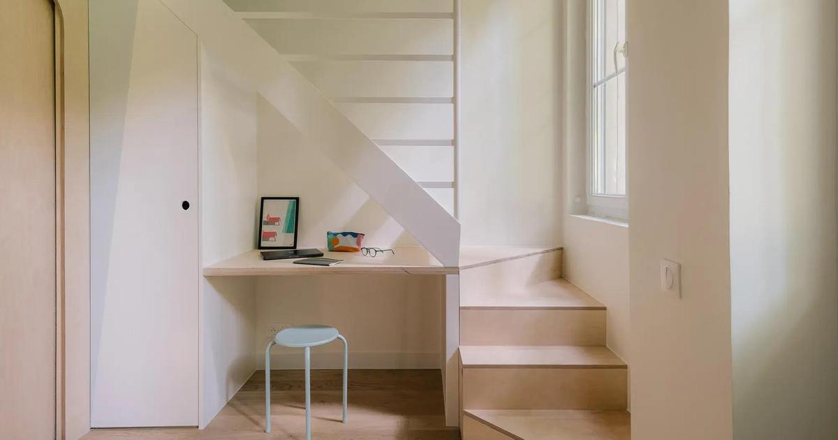 Лестница, ведущая к мезонину, стала самостоятельным архитектурным элементом. Ее нижние ступени, выполненные из дерева, скрывают системы хранения и формируют компактное рабочее место.