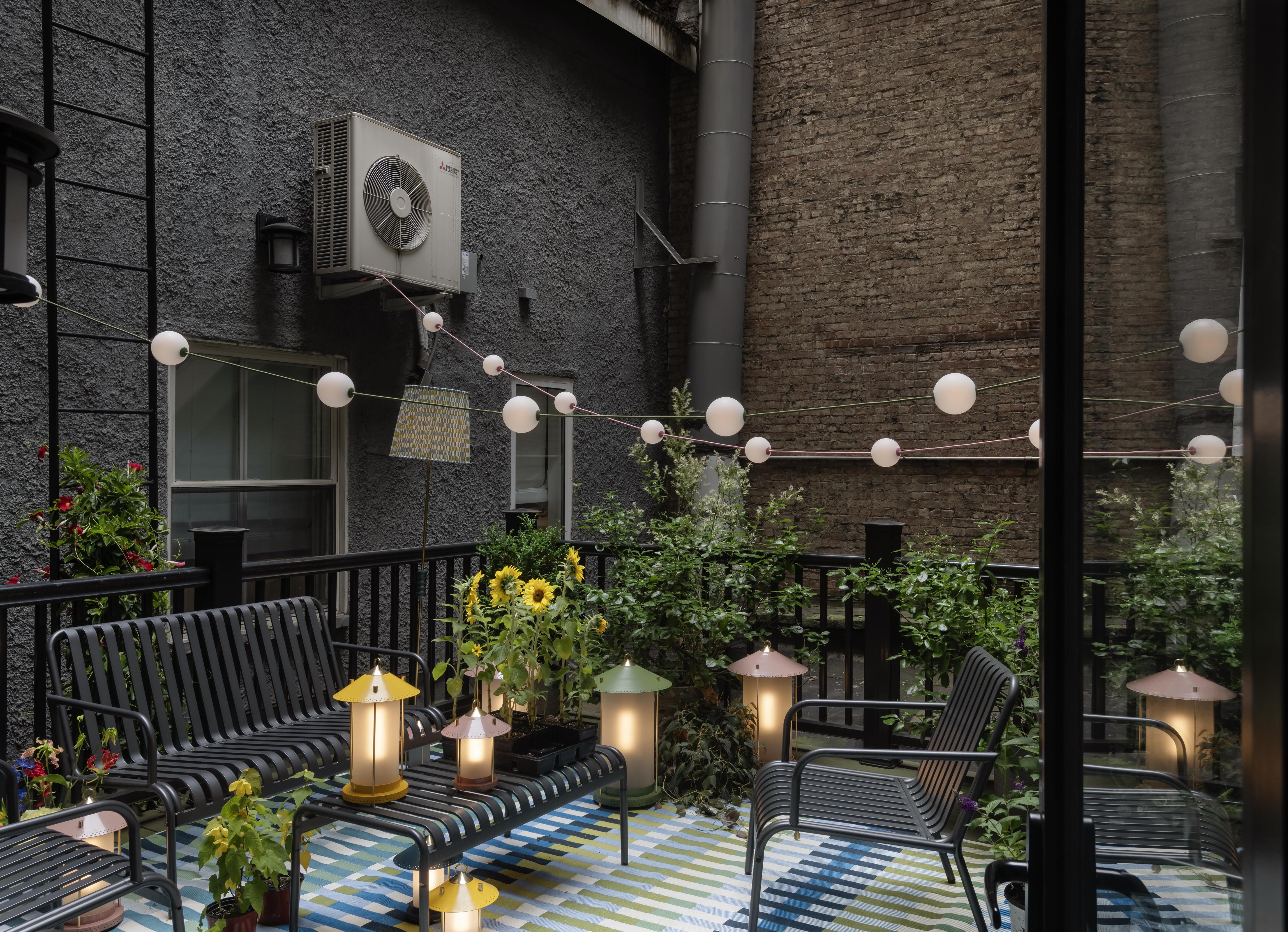 На открытой террасе — много зелени и светильников, создающих уютную атмосферу. Здесь пара любит проводить вечера.