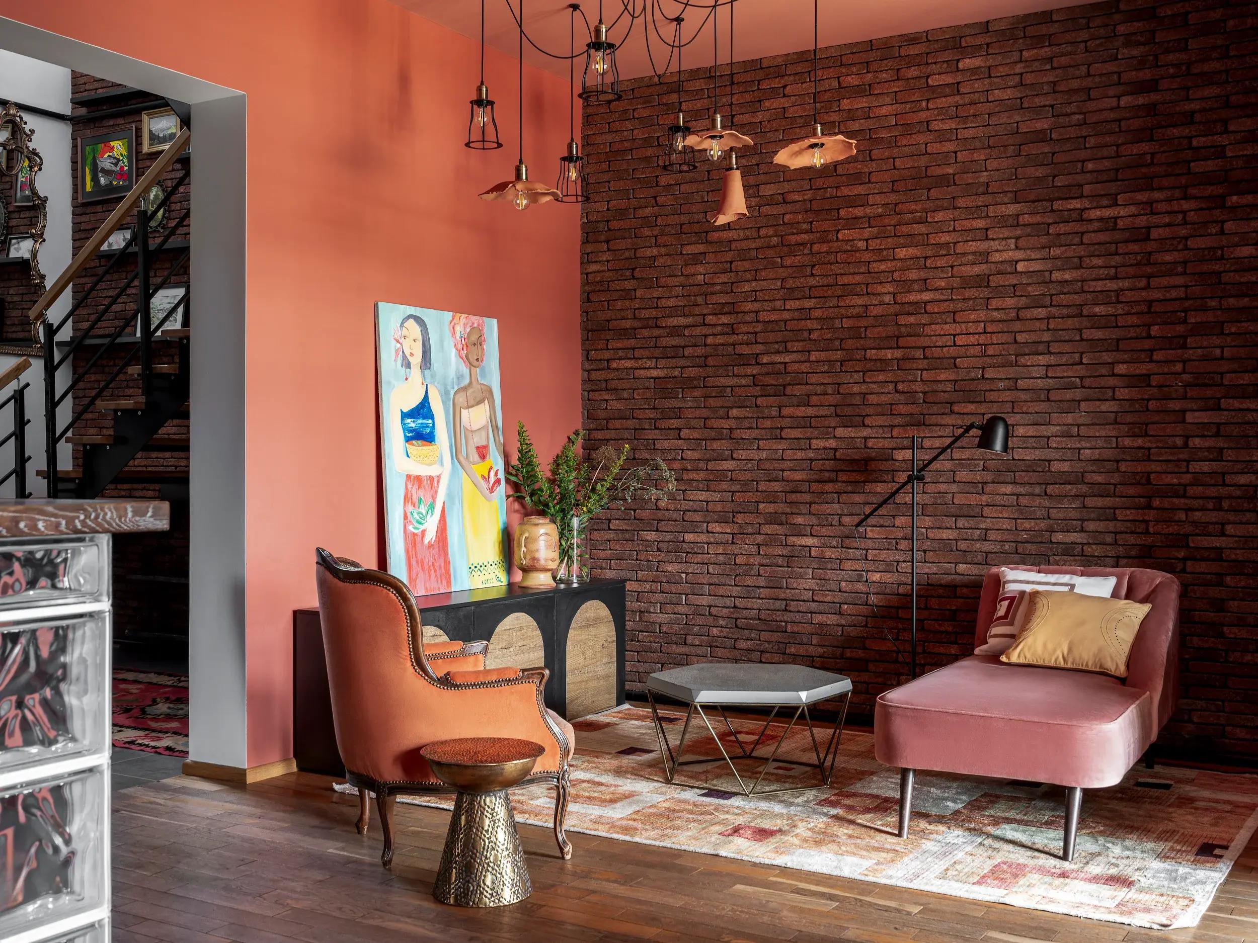Я мечтала о тактильном интерьере, к которому хочется прикоснуться, а не только рассматривать. Поэтому я решила играть на контрастах фактур, как на музыкальных инструментах: дуб, стекло, клинкерный кирпич, керамическая плитка… Мне хотелось, чтобы каждая стена, каждый угол о чем-то говорил. Вот, например, шероховатые фасады под бетон на кухне отражают любовь к индустриальной эстетике, бархатные кресла в гостиной — тягу к комфорту, а деревянные полы, стены и потолок — любовь к природе и натуральным материалам.