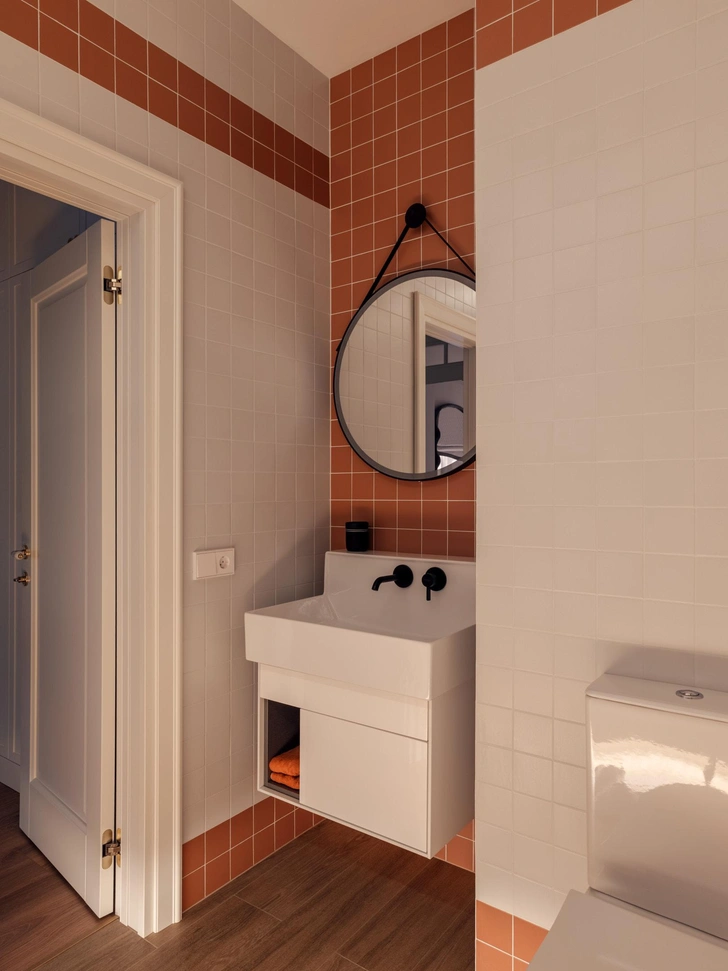 Ванная сделана в основных цветах квартиры: терракота и сливочный. На стенах — мозаичная плитка. Она оказалась разного размера, и строитель разобрал ее от сеток и каждую выкладывал отдельно. От этого швы получились не везде ровные, да и у самой плитки рельефная поверхность. Но поскольку я езжу на выставки в Милан уже не первый год, то точно знаю, что сейчас в моде ручная работа и легкая естественная небрежность. Поэтому решила, что это только плюс — она смотрится очень живой.