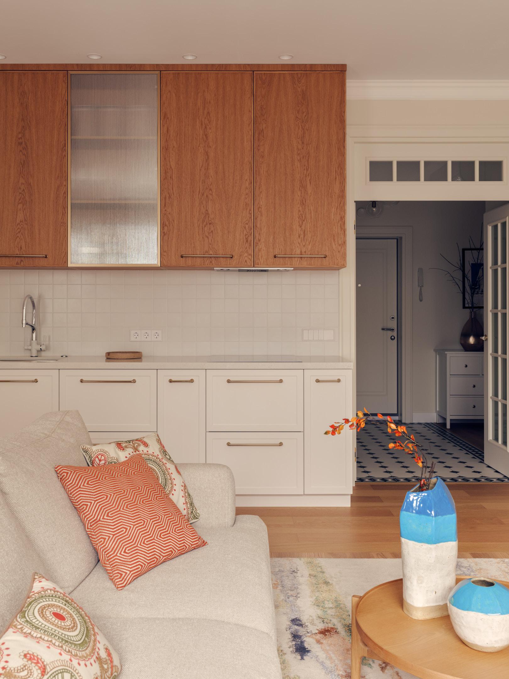 Диван и журнальный столик, Dantone Home. Керамика, Анна Гарбер. Кухня, Casa Vero. Плитка, Kerama Marazzi. Двери, «Волховец».