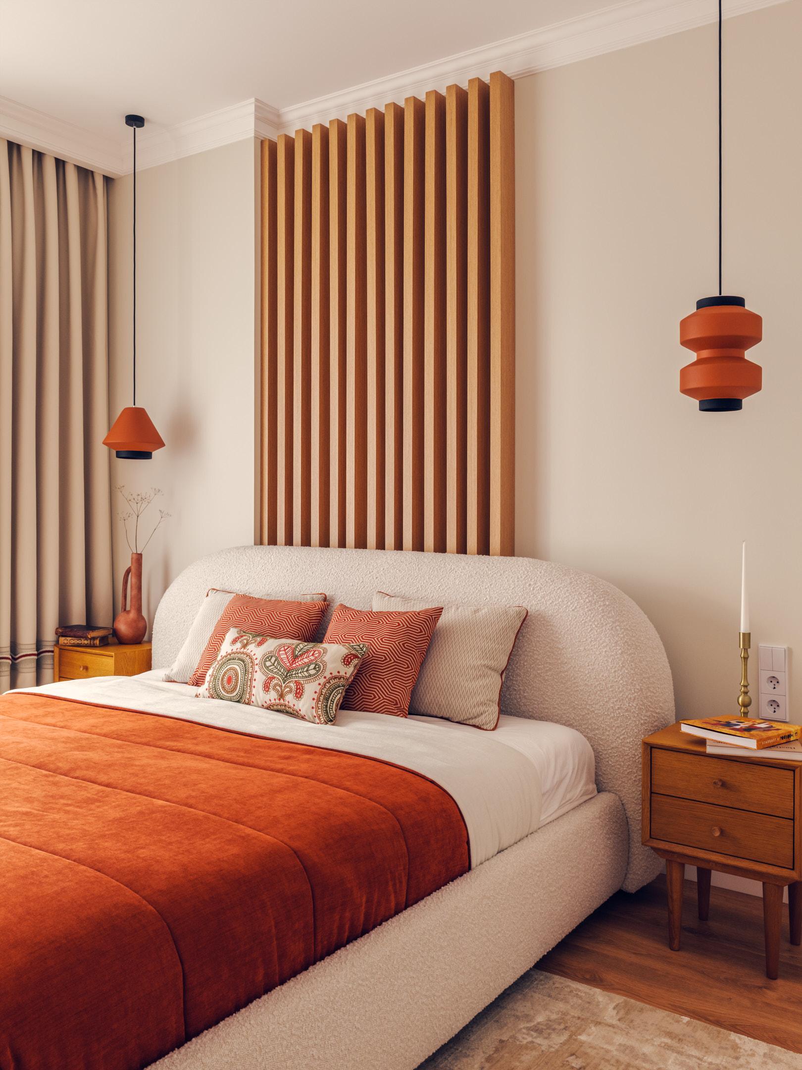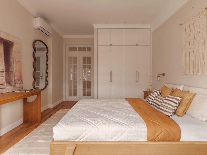 Кровать, Krawell. Двери, «Волховец». Консольный столик, La Redoute. Зеркало, Dantone Home. Макраме, студия «Нить вдохновения». Шкаф, ателье мебели Casa Vero. Ковер, Art de Vivre. Текстиль, ателье «Флер». Картина, Юрий Первушин, RakovGallery.
