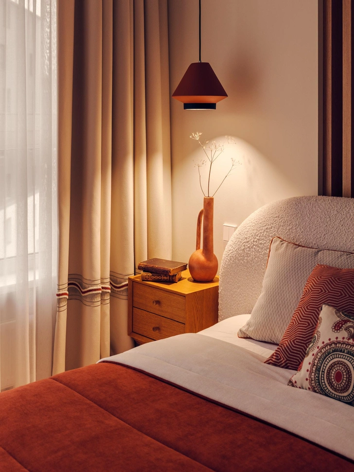Кровать, Dantone Home. Светильники, Svoy Design. Прикроватные тумбы, La Redoute. Ковер, Art de Vivre. Текстиль, ателье «Флер».