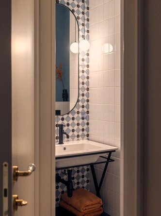 Плитка Chic Howard Blue, Dual Gres. Тумба с раковиной, зеркало и смеситель, Kerama Marazzi. Светильник, Maytoni.