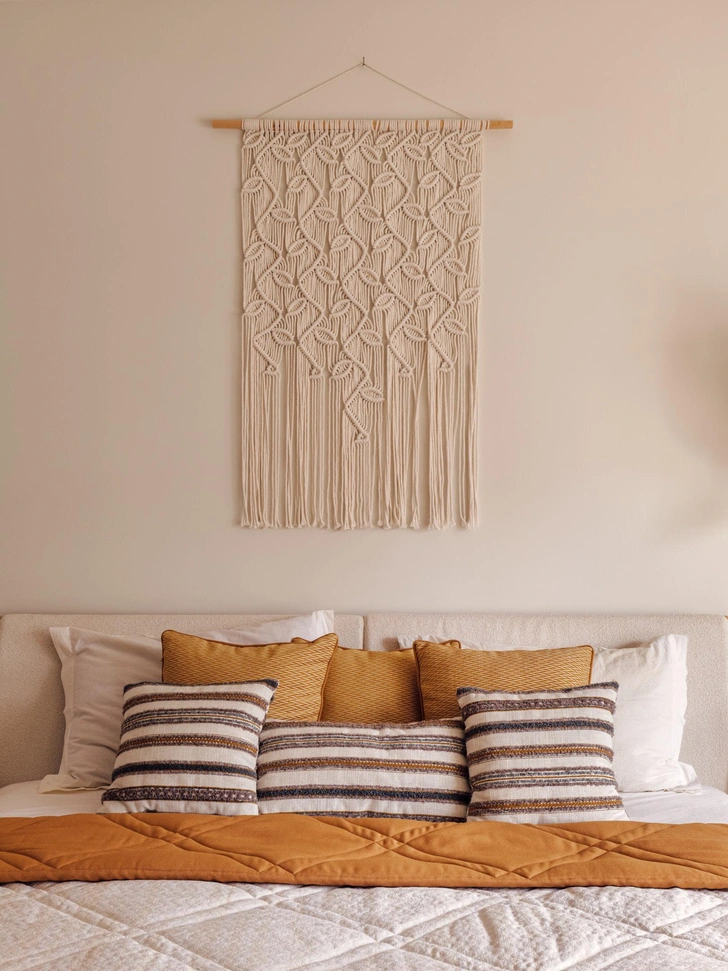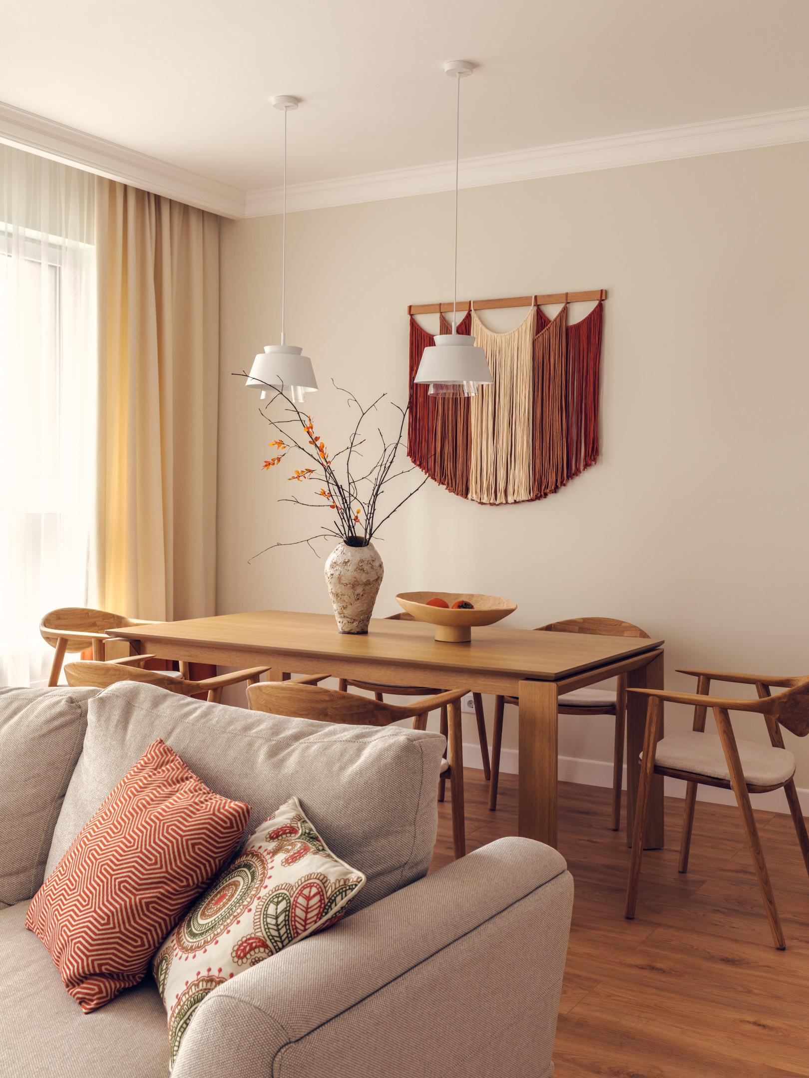 Я стремлюсь к тому, чтобы пространство выглядело живым и обжитым уже сразу, с новоселья. Поэтому стараюсь насыщать интерьер декором и предметами ручной работы, как будто в квартире живут уже давно, и у нее есть своя история. В этом случае мы начали со скандинавской темы, так что у нас появилось макраме — его сделала местный мастер по моим эскизам.