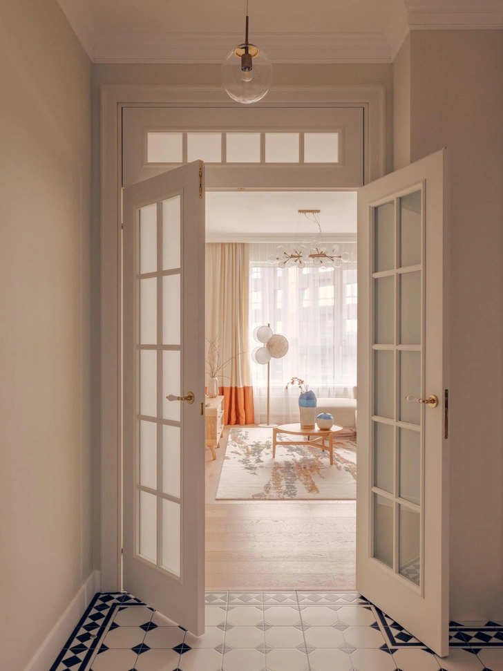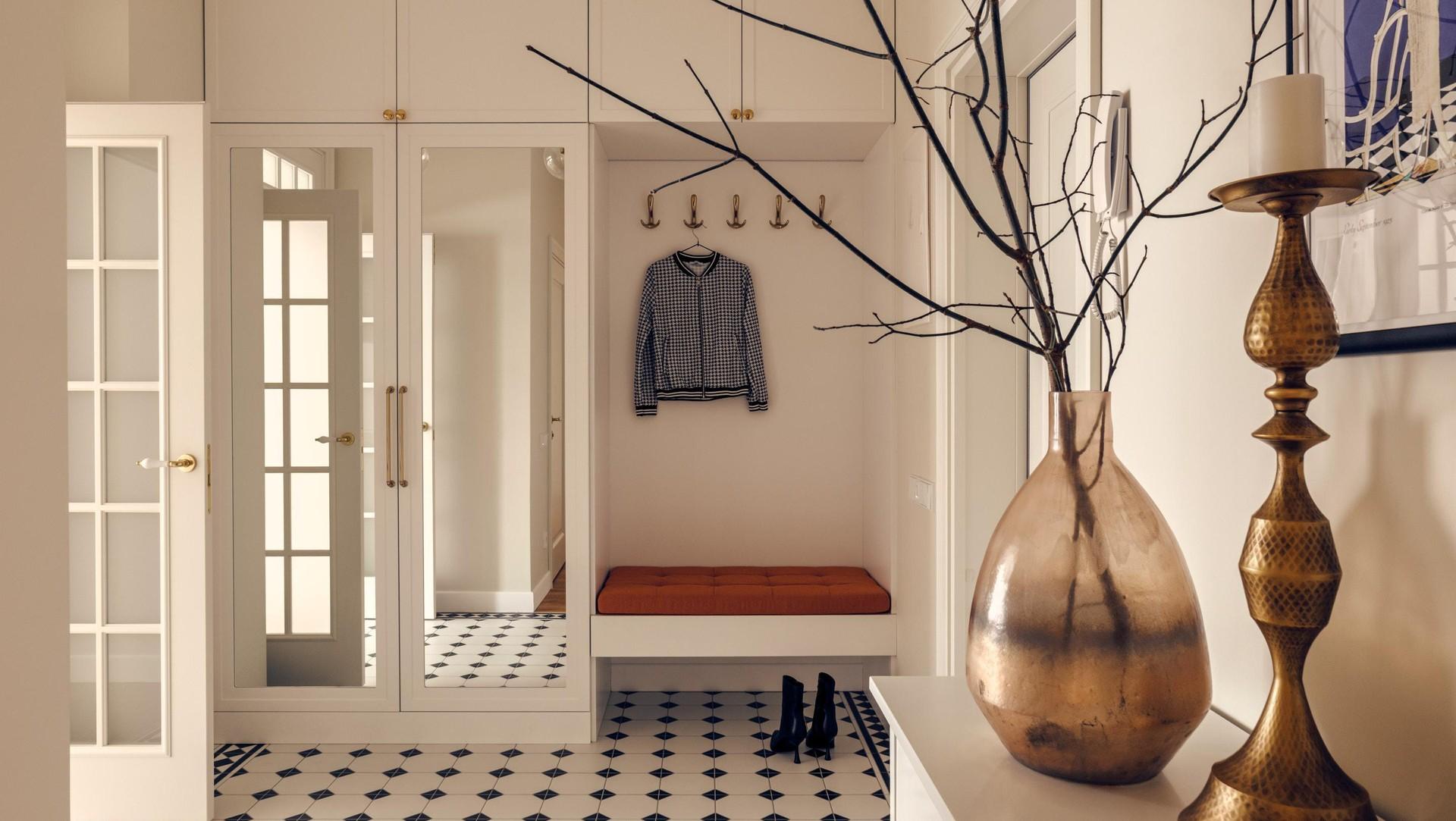Когда мы только зашли в эту квартиру с заказчицей, здесь было очень темно — и она очень расстроилась. Чтобы это исправить, мы убрали часть стен и расширили проемы. Благодаря этому солнечный свет попадает из гостиной в прихожую и из спальни в ванную. Прихожую мы оформили нарядно, она отличается от остальных зон.