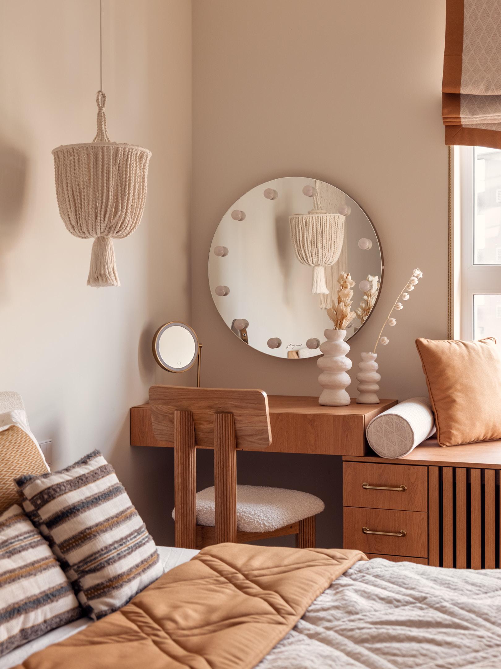 Стул, La Redoute. Зеркало, Johny Wood. Вазы, Danton Home. Туалетный столик, светильник макраме, студия «Нить вдохновения».